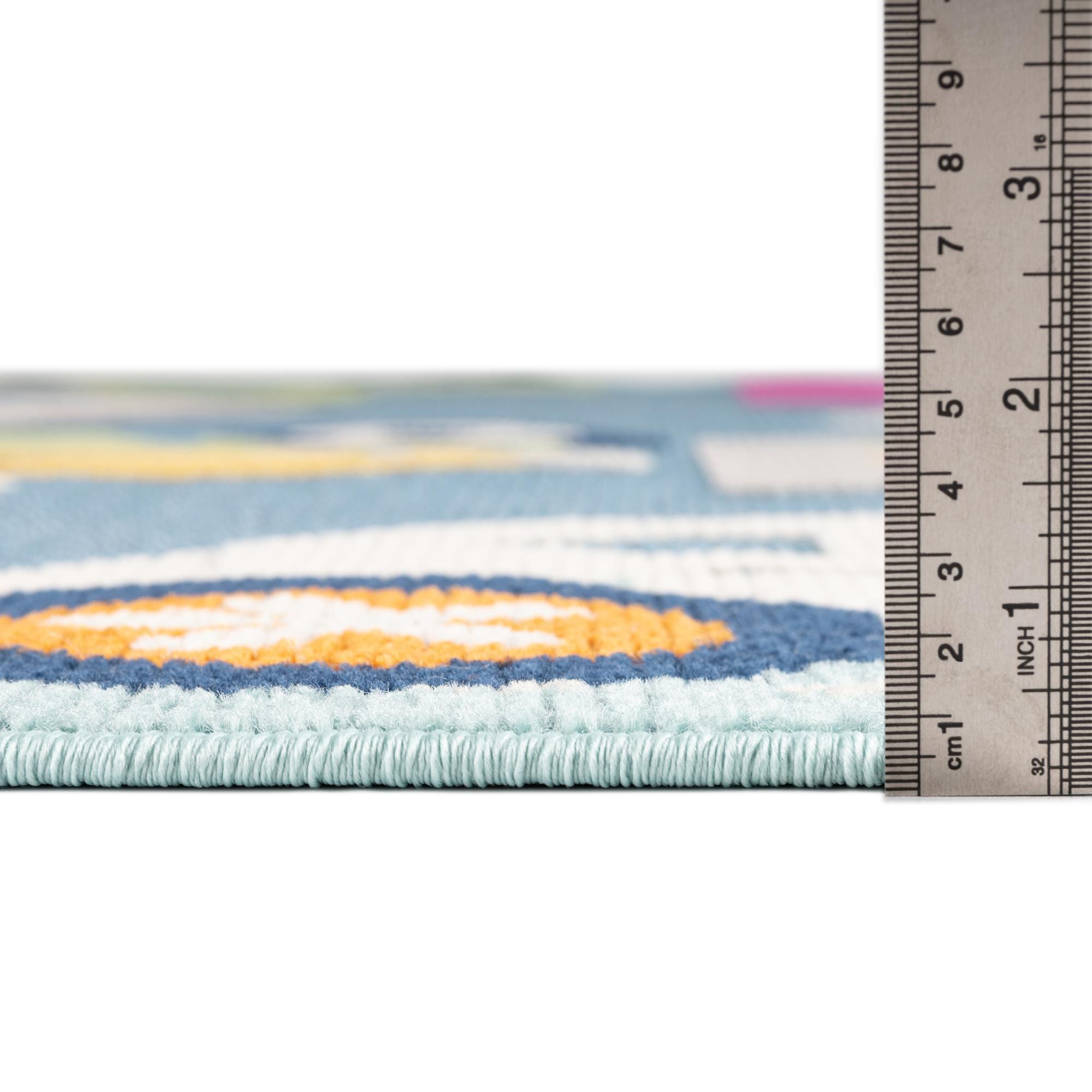 Primary color is Light Blue. Colors in this rug include: Light Blue, Blue, Gray, Ivory, Orange, Yellow, Pink, Navy Blue.