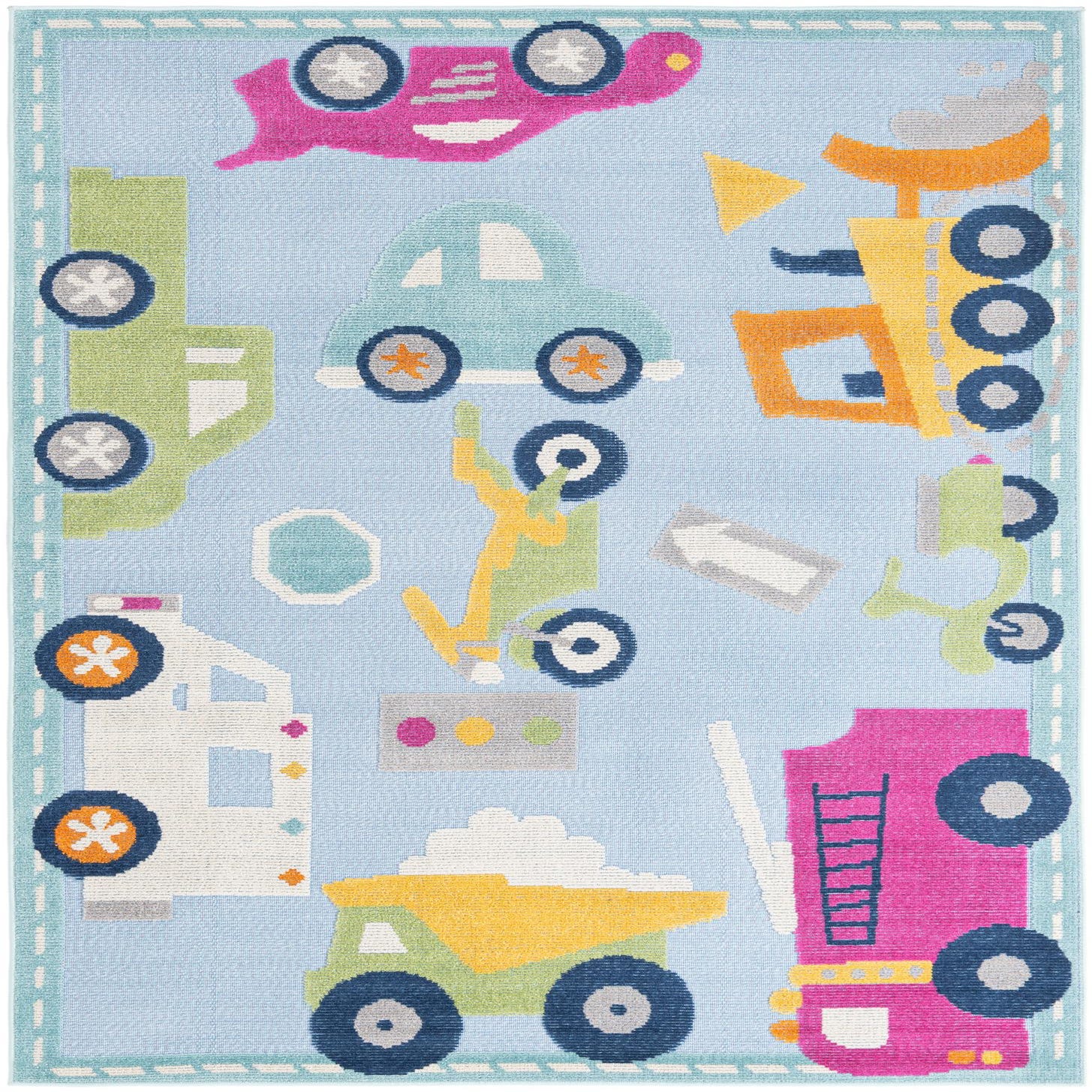 A 5x8 light blue rectangular rug with a modern pattern of colorful cartoon vehicles like cars, trucks, and fire engines.