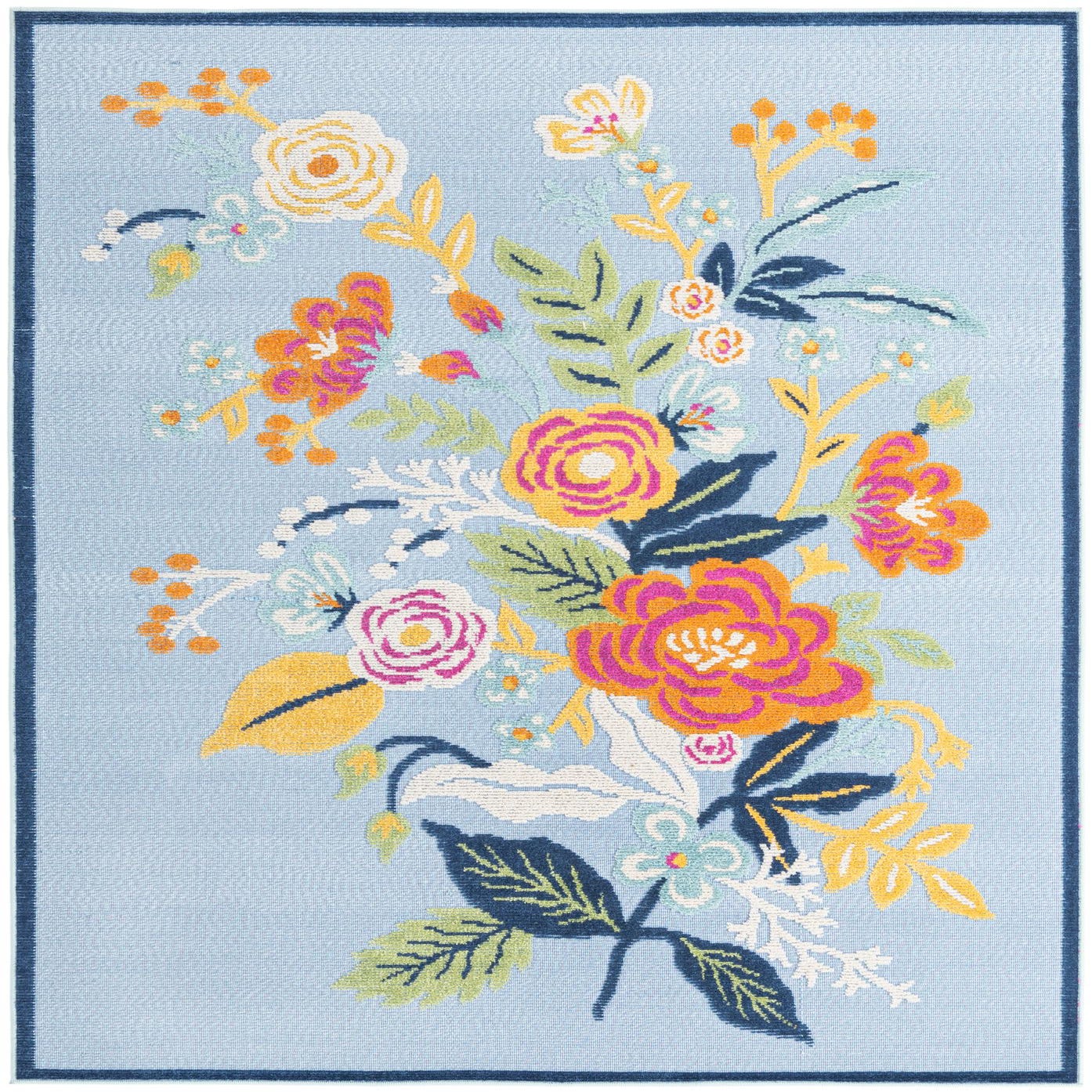Primary color is Light Blue. Colors in this rug include: Light Blue, Ivory, Light Green, Navy Blue, Orange, Yellow, Pink.