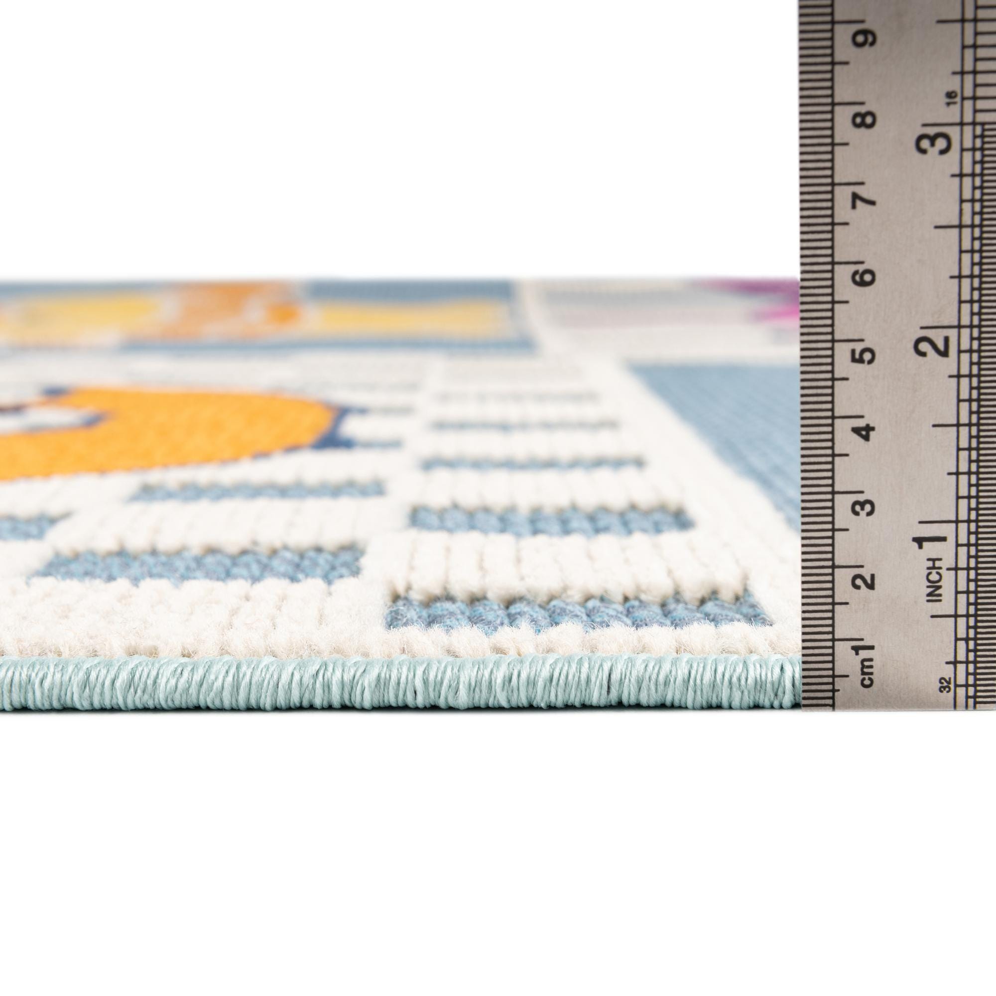 Primary color is Light Blue. Colors in this rug include: Light Blue, Gray, Ivory, Light Green, Orange, Yellow, Pink, Navy Blue.