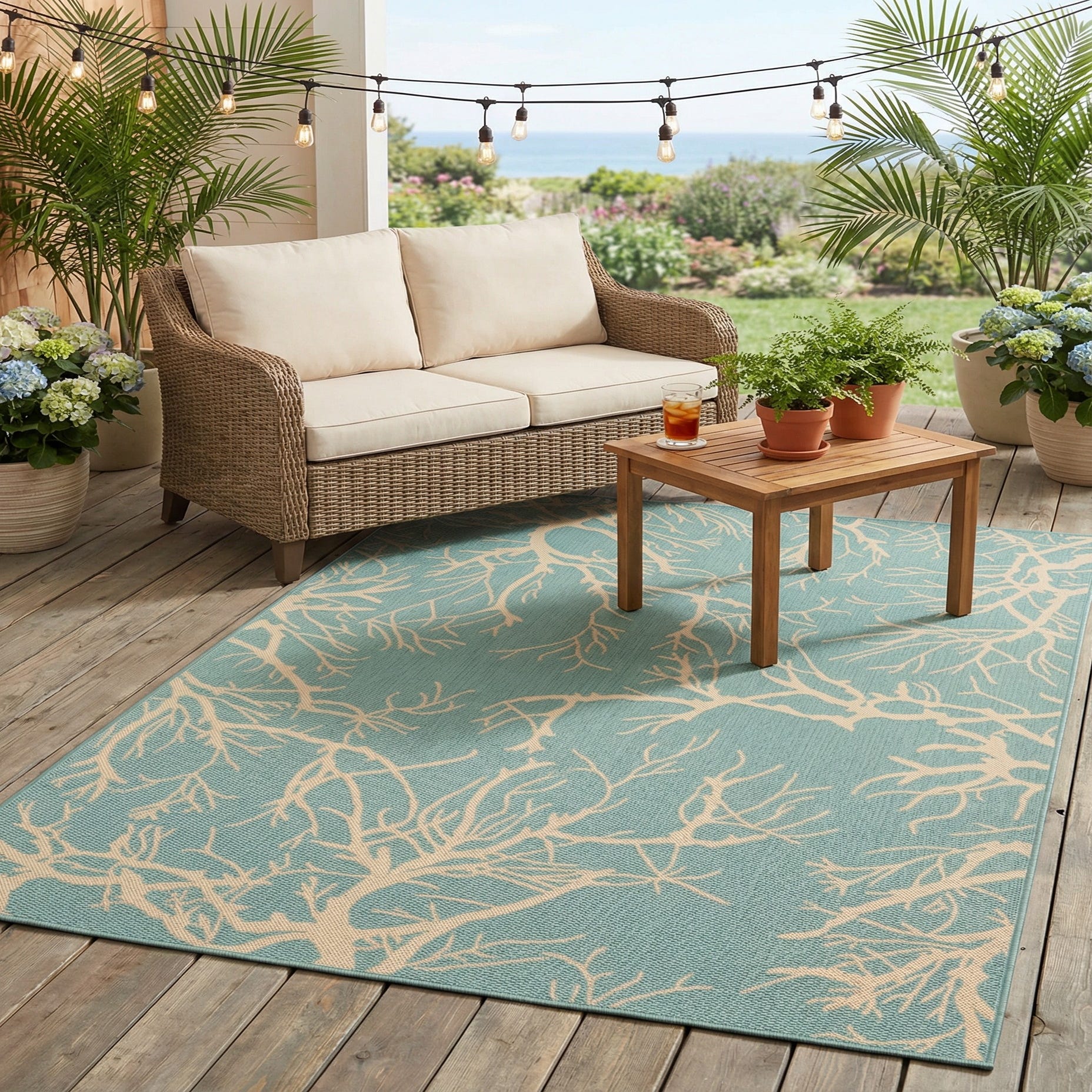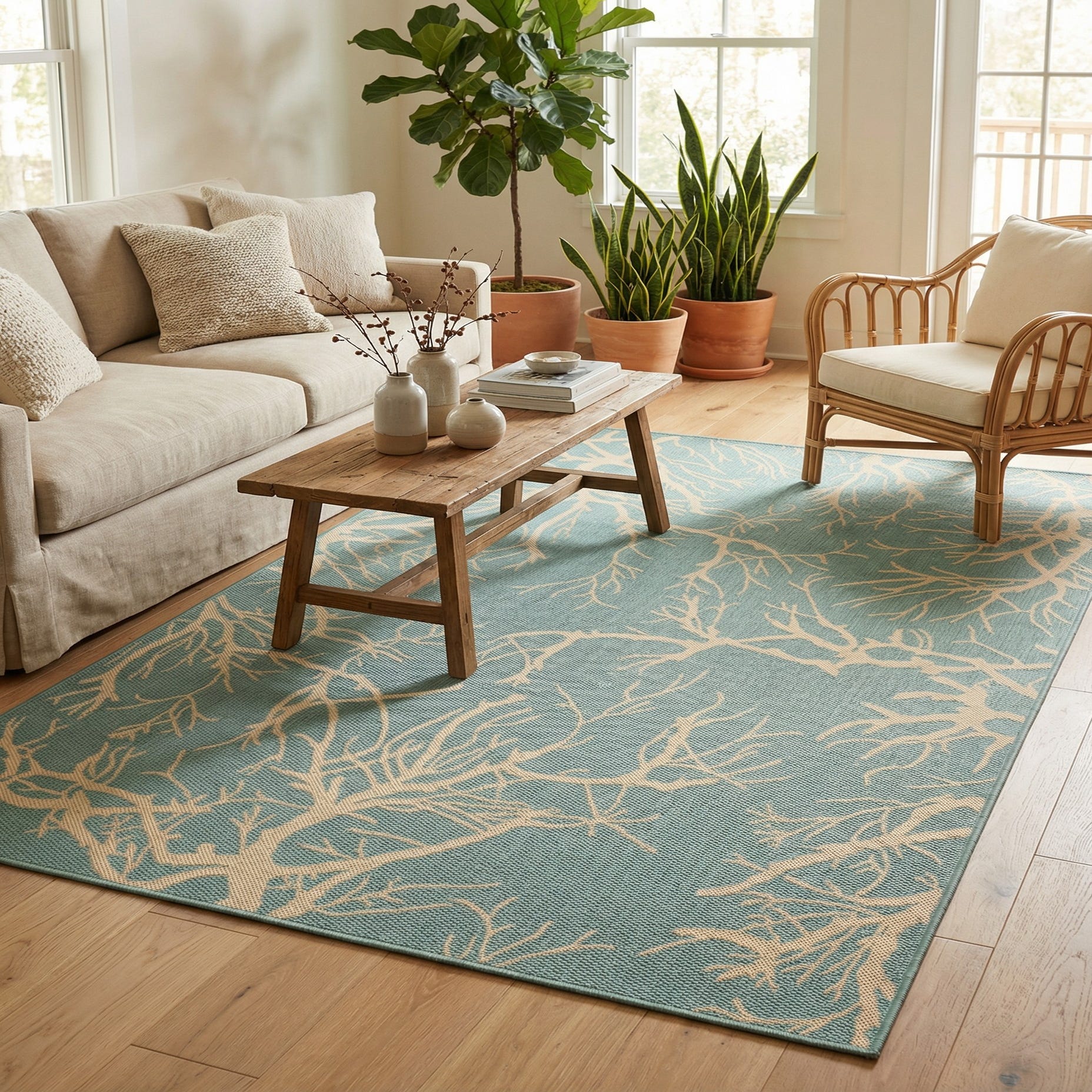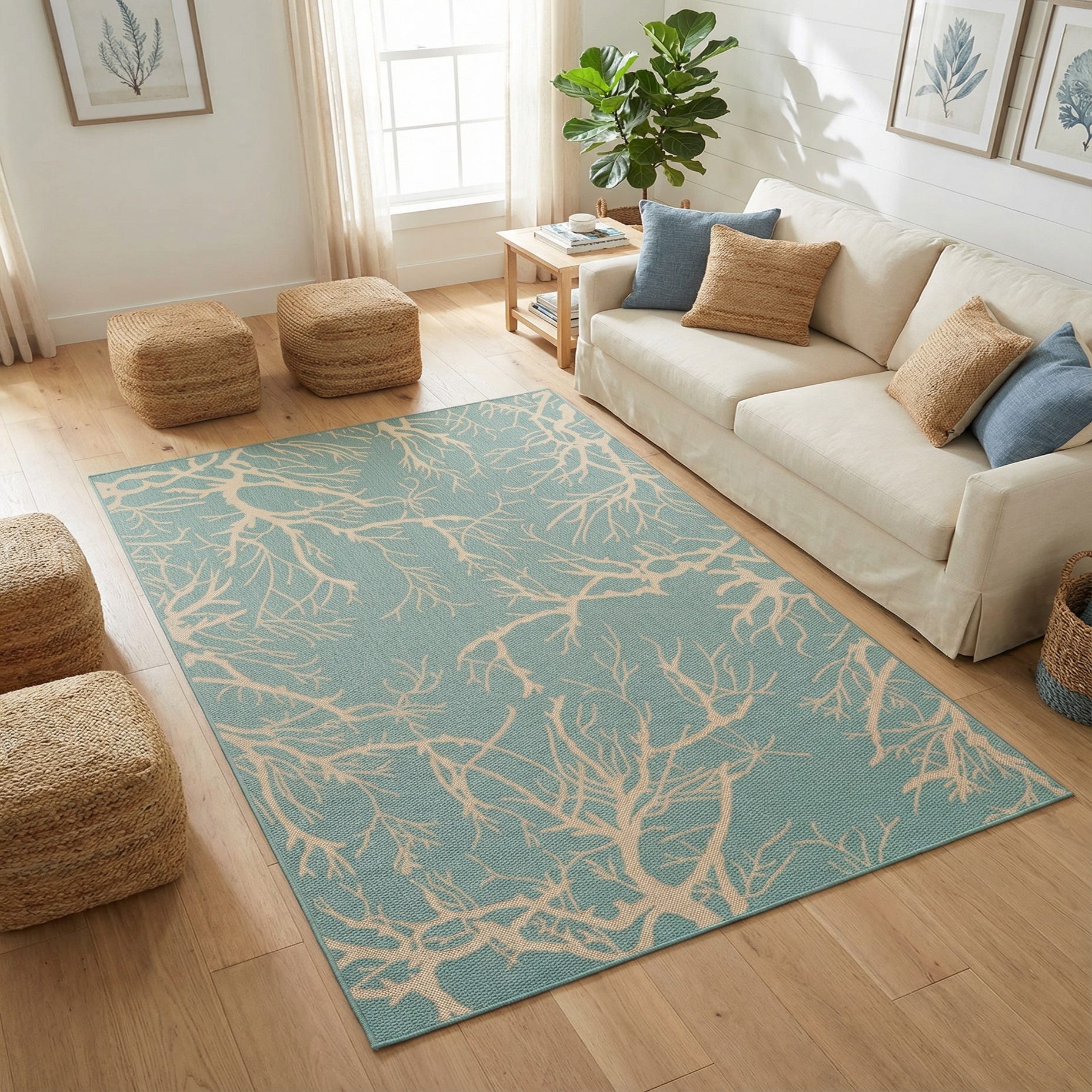 This piece works well in covered outdoor spaces, sunrooms, or casual living rooms and dining areas where a relaxed, seaside palette is desired. Pair it with wicker or weathered-wood furnishings, linen upholstery, and touches of navy or sand for a coastal look, or layer it under a glass-top dining table and metal accents for a modern, transitional setting. The light-blue and beige combination brings a serene, collected vibe to both indoor and sheltered alfresco environments.