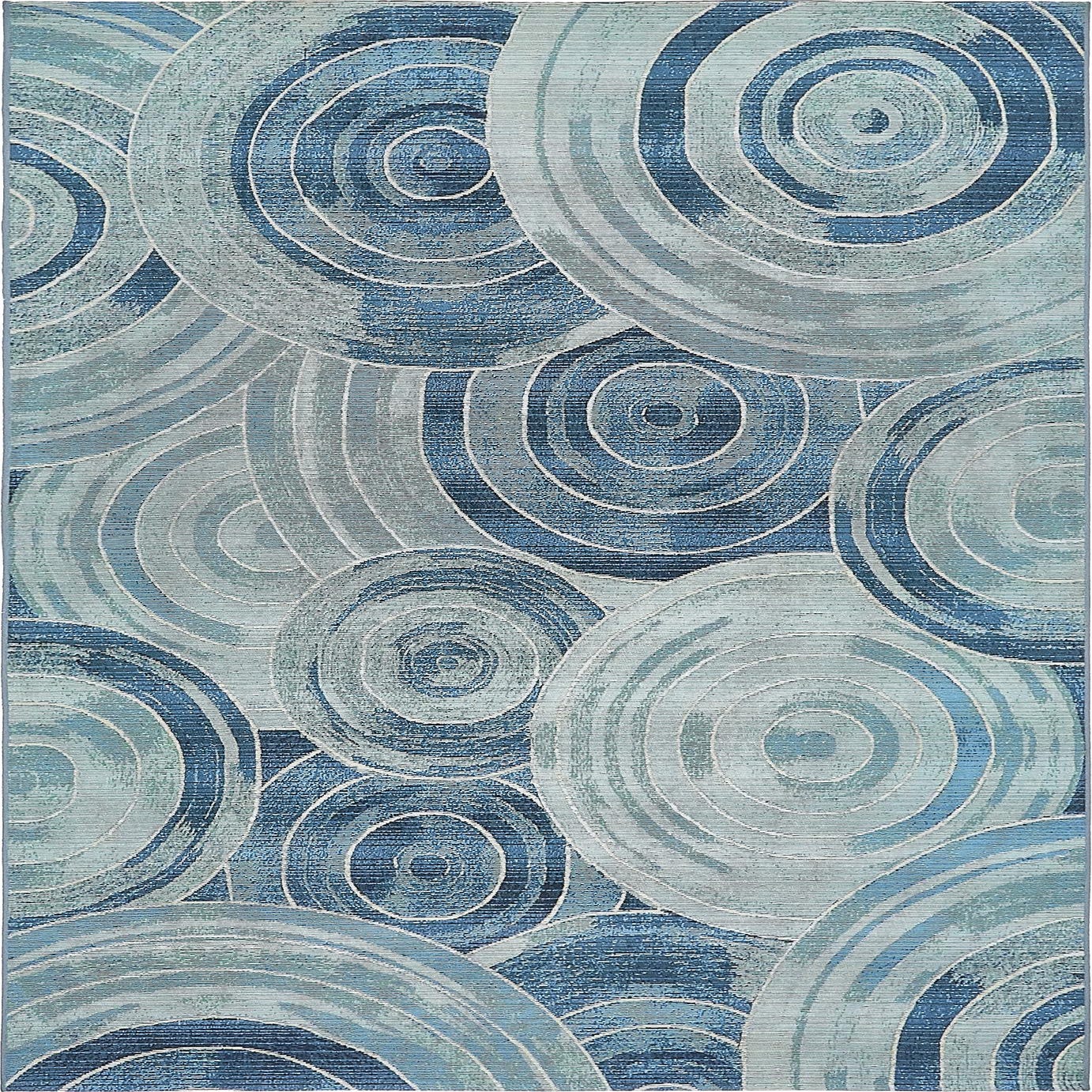A 5x8 rectangular indoor/outdoor rug featuring an abstract coastal pattern of overlapping blue and light blue concentric circles.