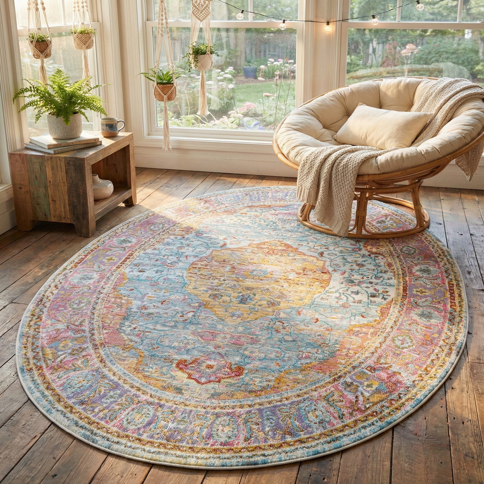 Machine made of 100% polypropylene, the rug has a low pile and tight weave that feels smooth underfoot with a subtle textured surface where the pattern registers. The oval silhouette fits well under a coffee table, at the foot of a bed, or in an entry to guide circulation. Style it with navy or cream upholstery and warm wood tones for a coastal or transitional living room, layer it over natural jute and rattan for a relaxed bohemian scheme, or use it to introduce color and pattern into a neutral contemporary space with brass or antique-metal accents.