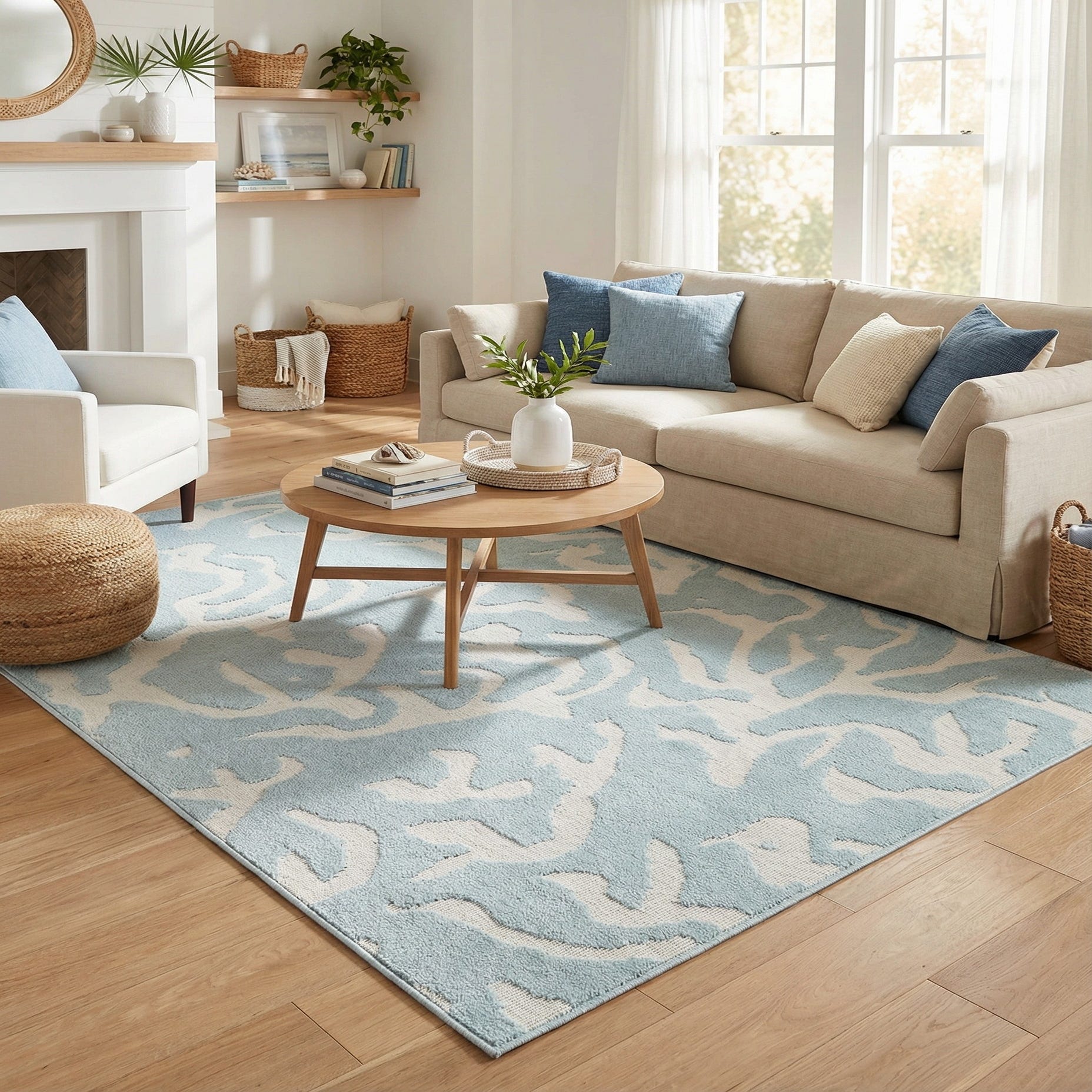 This rug works well on covered patios, balconies, or poolside seating as well as in sunrooms and casual living rooms. Pair it with wicker or whitewashed wood furniture, linen slipcovers, and brushed-metal accents for a modern coastal vibe, or combine it with natural-fiber textures and soft neutrals for a relaxed transitional space. It also serves nicely under a small dining set or to anchor a conversational seating area, bringing a light, breezy foundation to both indoor and outdoor living spaces.