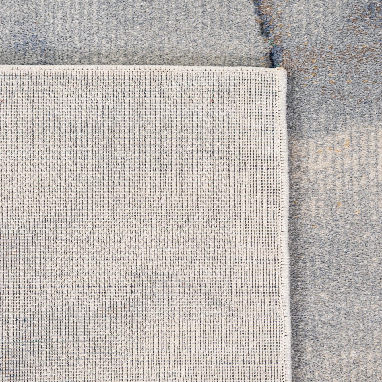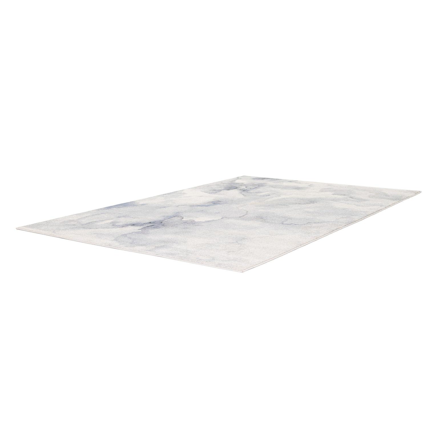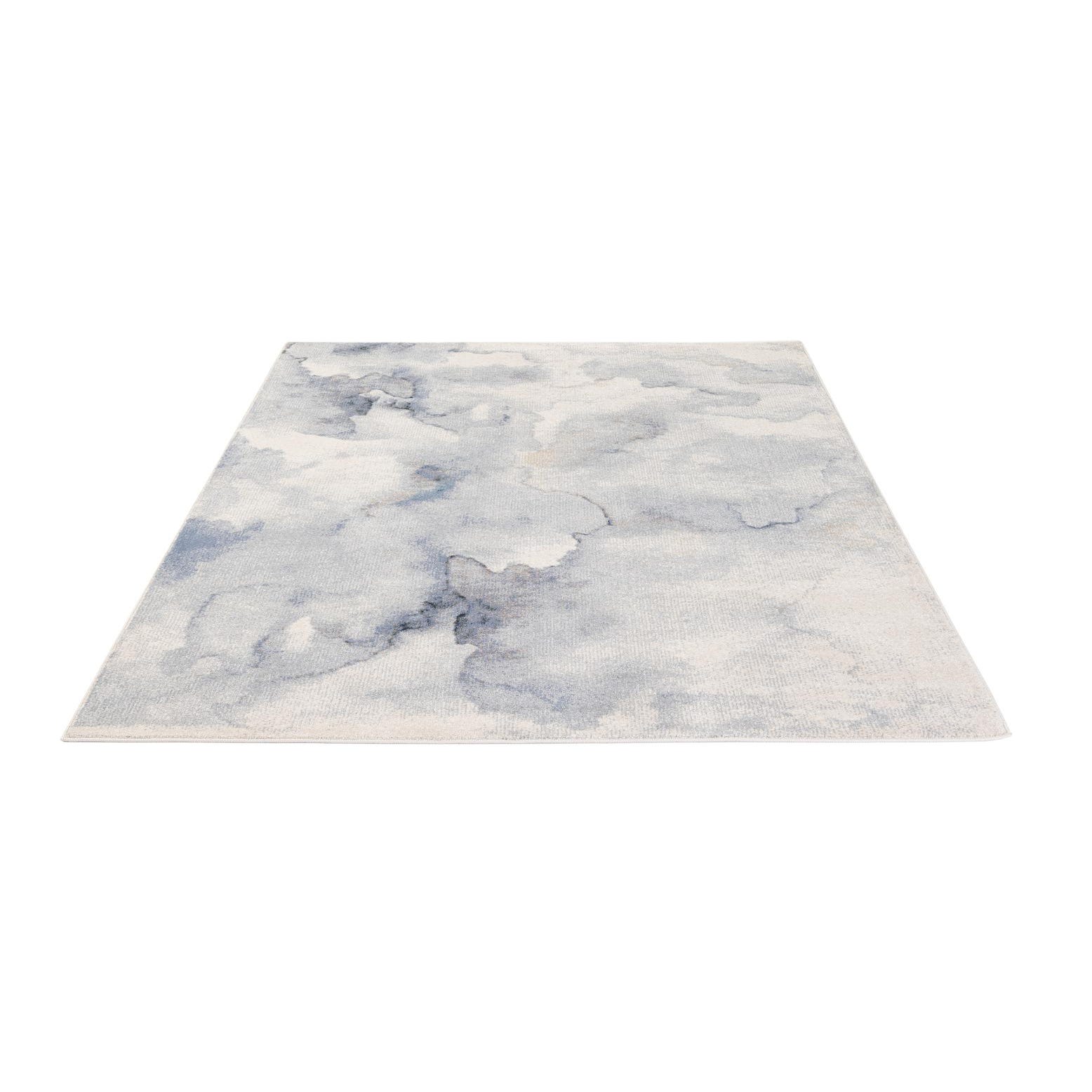 A 5x8 rectangular indoor rug featuring an abstract watercolor pattern in various shades of light blue and cream.