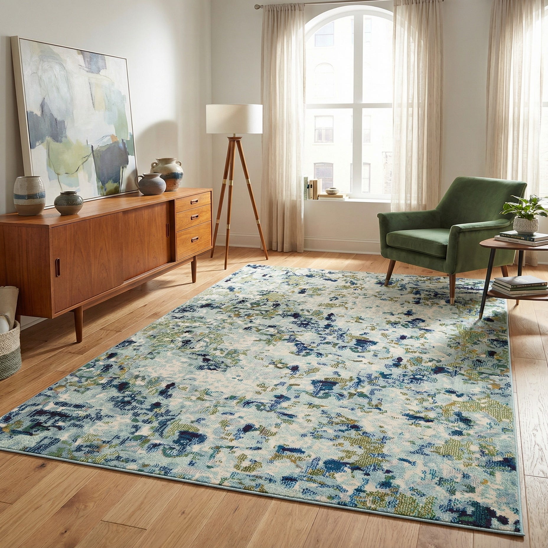 This piece fits easily into coastal, transitional, or modern interiors. Place it beneath a neutral linen sofa with navy throw pillows to pull out the deeper blues, or set it under a light wood dining table to introduce color without overwhelming the room. It also works well in a bedroom or home office, layered with natural fibers like rattan or oak and cream upholstery to emphasize the rug’s calm, breezy palette.
