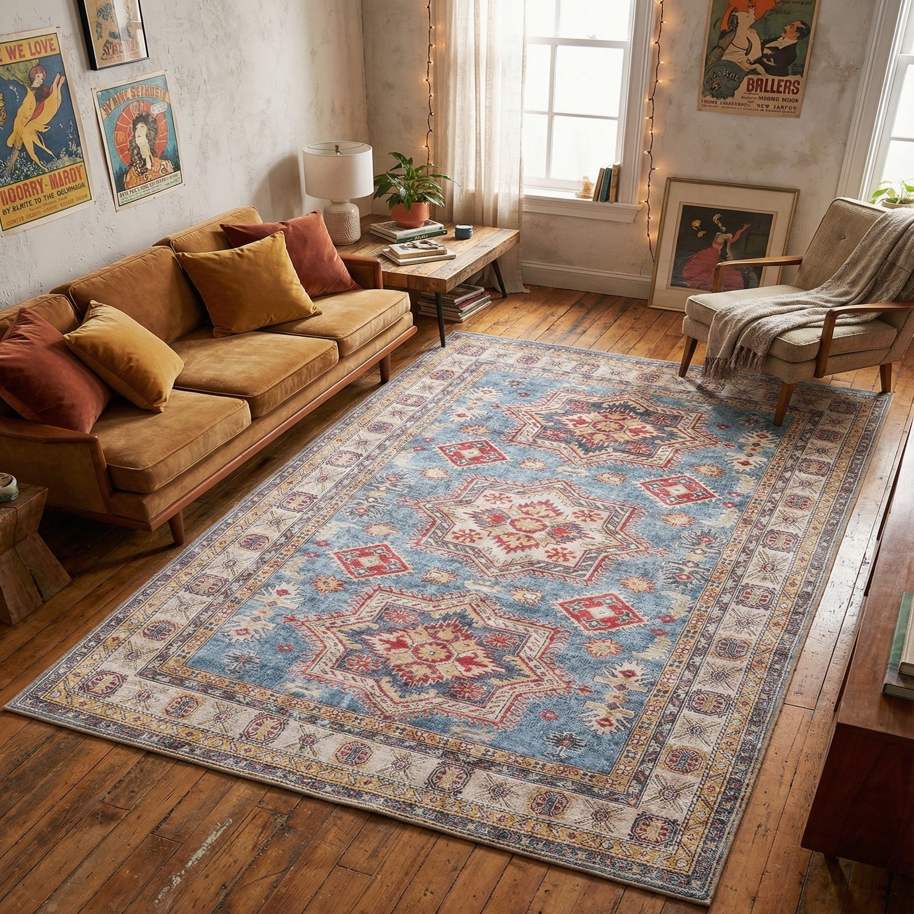 A 5x8 rectangular light blue oriental rug with a distressed medallion pattern in red, gold, and cream, featuring a traditional border.