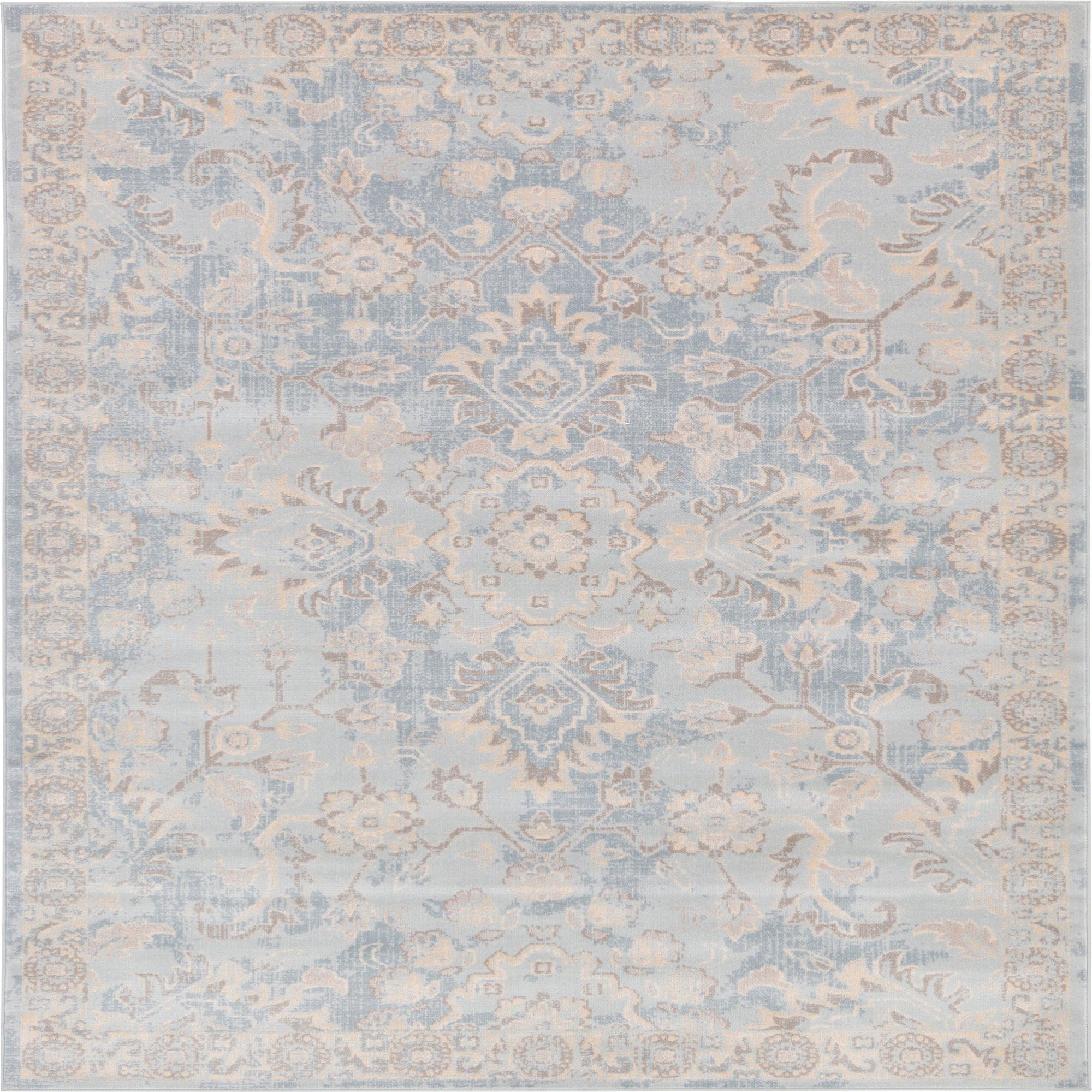 A light blue 5x8 rectangular area rug with a distressed traditional medallion and botanical pattern in cream and beige.