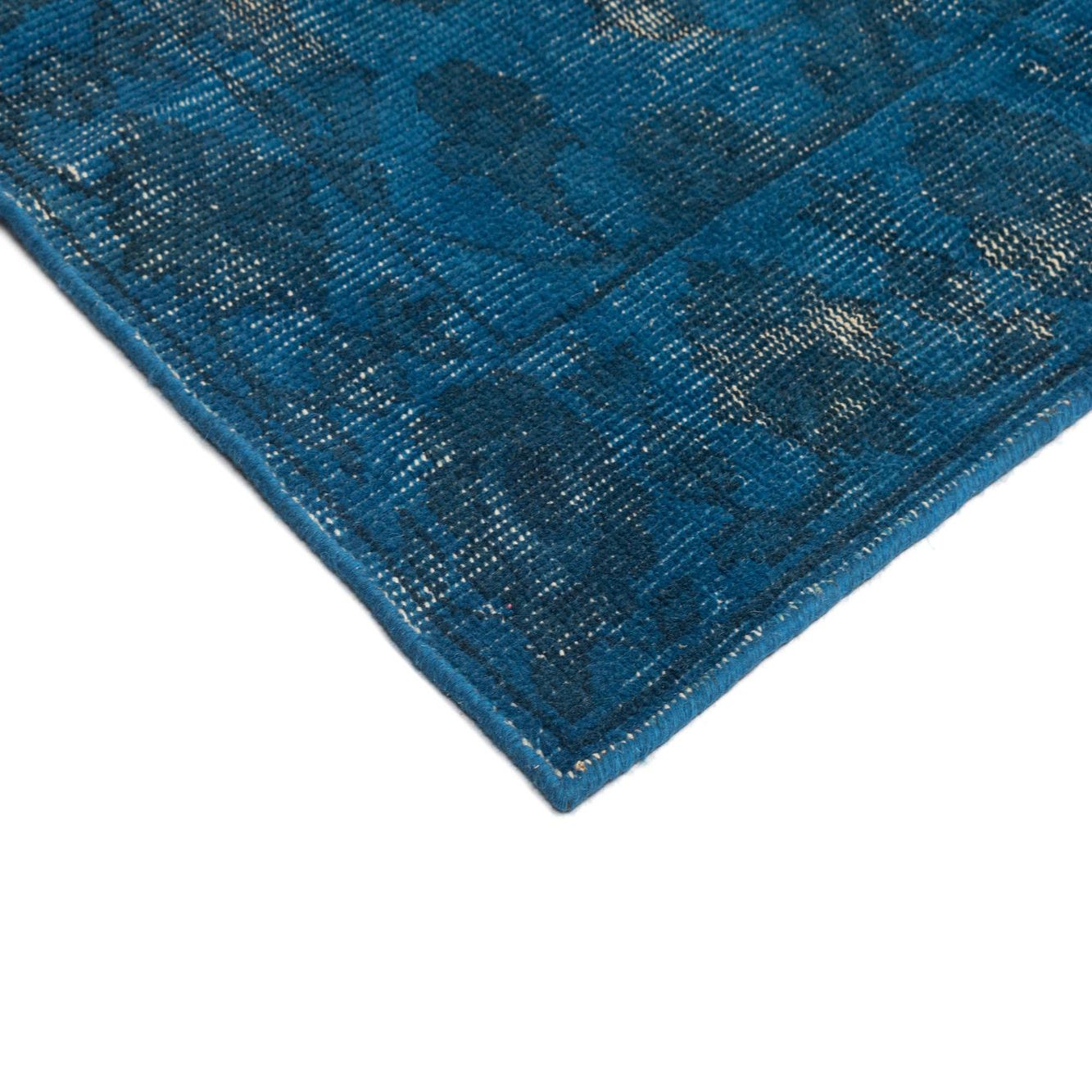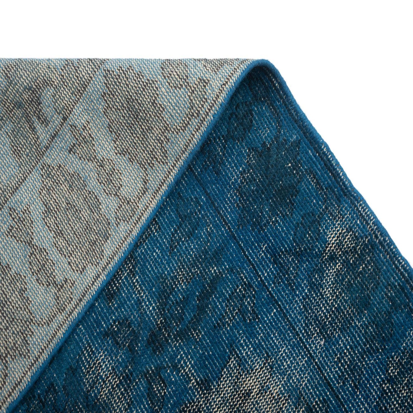 This hand-made wool rug from the Vintage collection showcases a rich array of colors set against a light blue background, creating a captivating aesthetic. The rug features a pattern that has been intentionally distressed to offer a time-worn look that evokes the charm of antique textiles. This nuanced visual effect is highlighted by variations of indigo and navy, juxtaposed with subtle gray accents that enhance the design's vintage appeal.