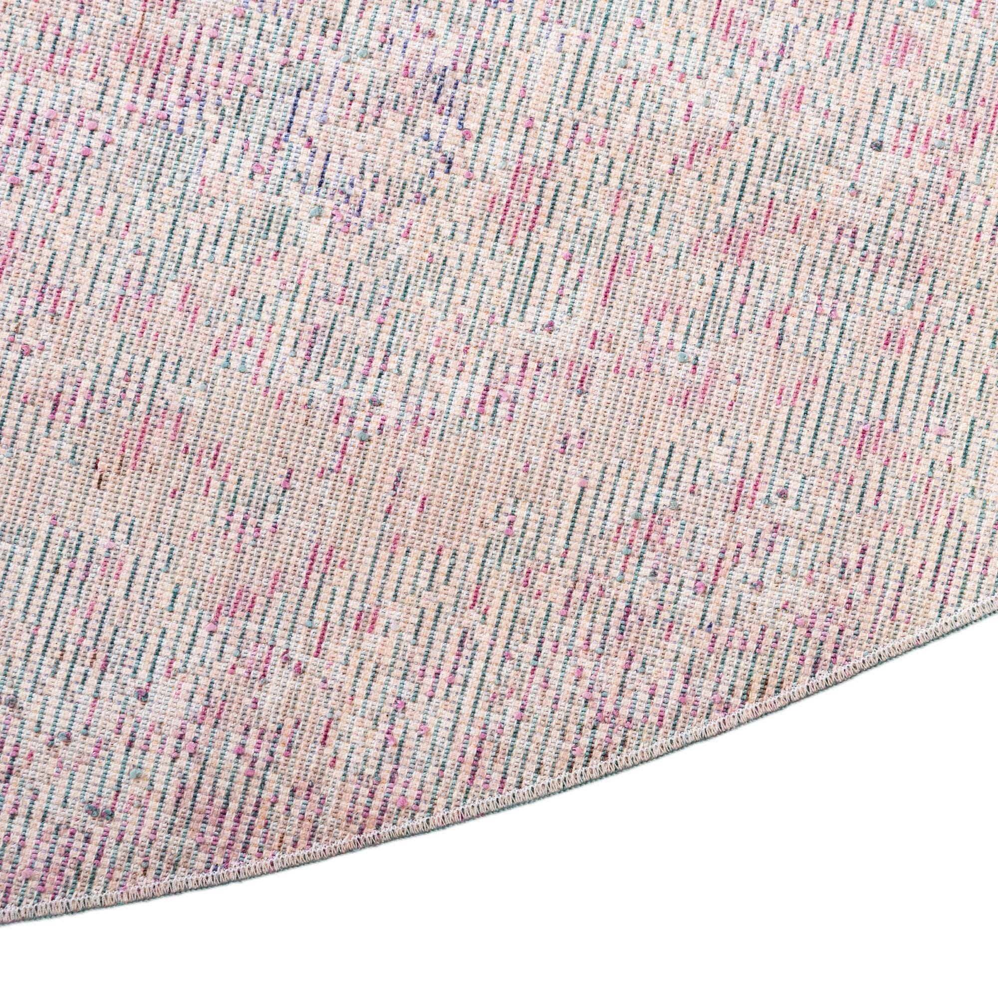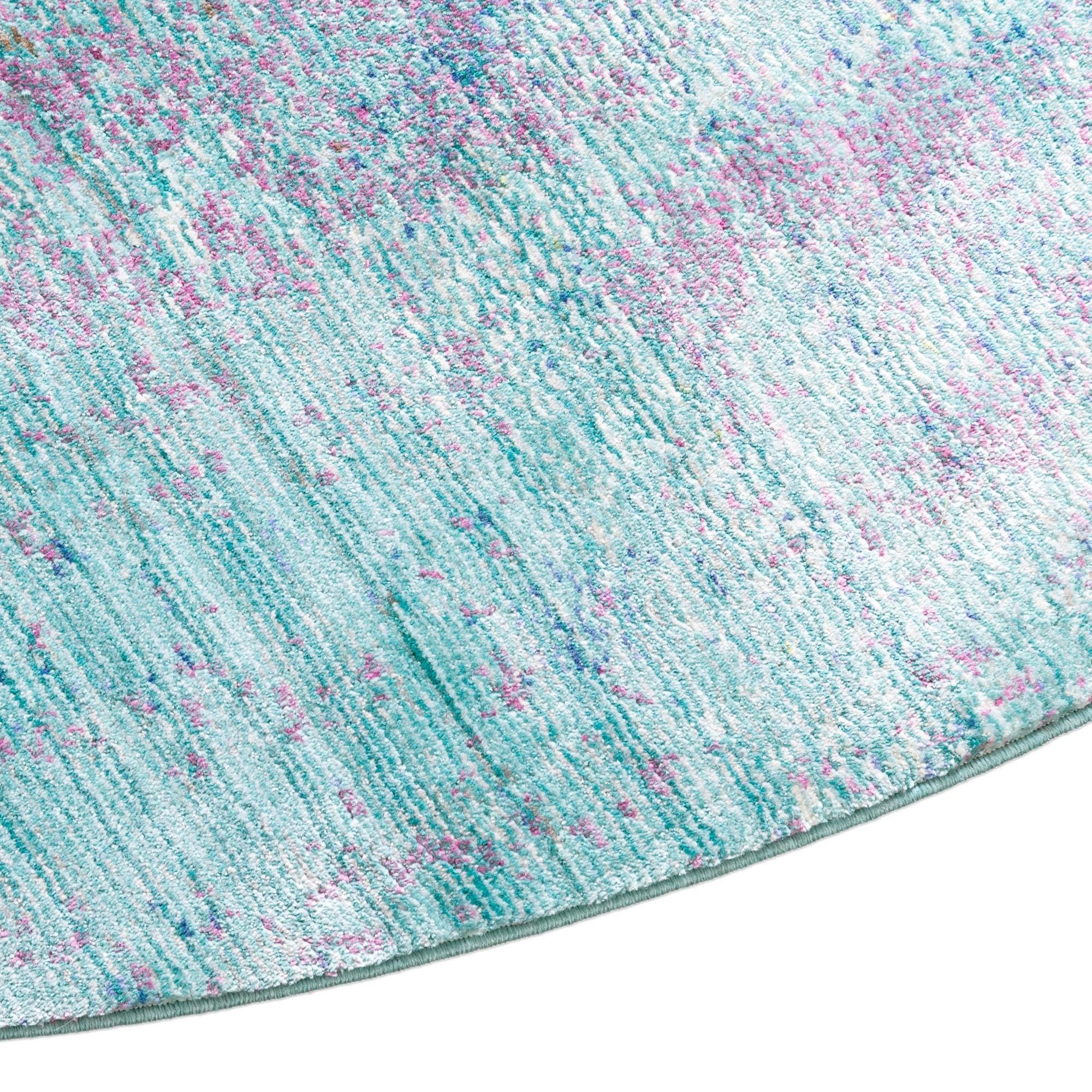 Machine made from 100% polyester, the rug has a low-profile pile with a smooth, slightly lustrous hand that layers well under furniture and holds its shape. It works well beneath a round dining table, as a soft focal point in a bedroom or nursery, or anchored under a small seating group in a contemporary living room. The color palette and subtle vintage-inspired texture suit coastal, modern farmhouse, and eclectic interiors, and it pairs easily with natural woods, light neutrals, or deeper navy accents.