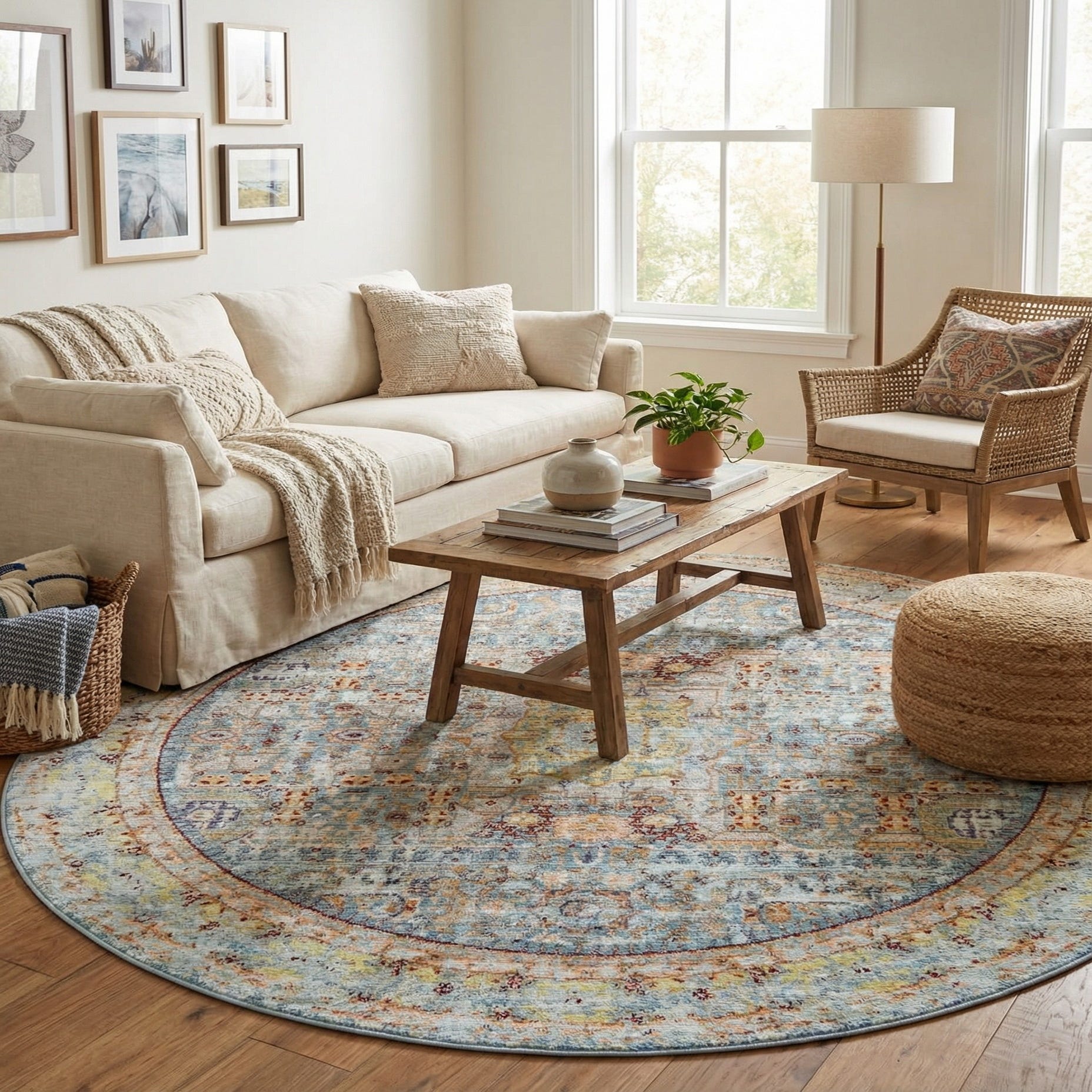 Soft, layered color and an aged, ornamental pattern define this round area rug. A light blue field sets the stage for a central medallion and repeating floral-geometric motifs worked in cream, ivory, gold, peach, red, gray and touches of yellow. The design has a gently distressed finish with a narrow inner ring and a broader outer border that add structure and visual depth without feeling heavy.