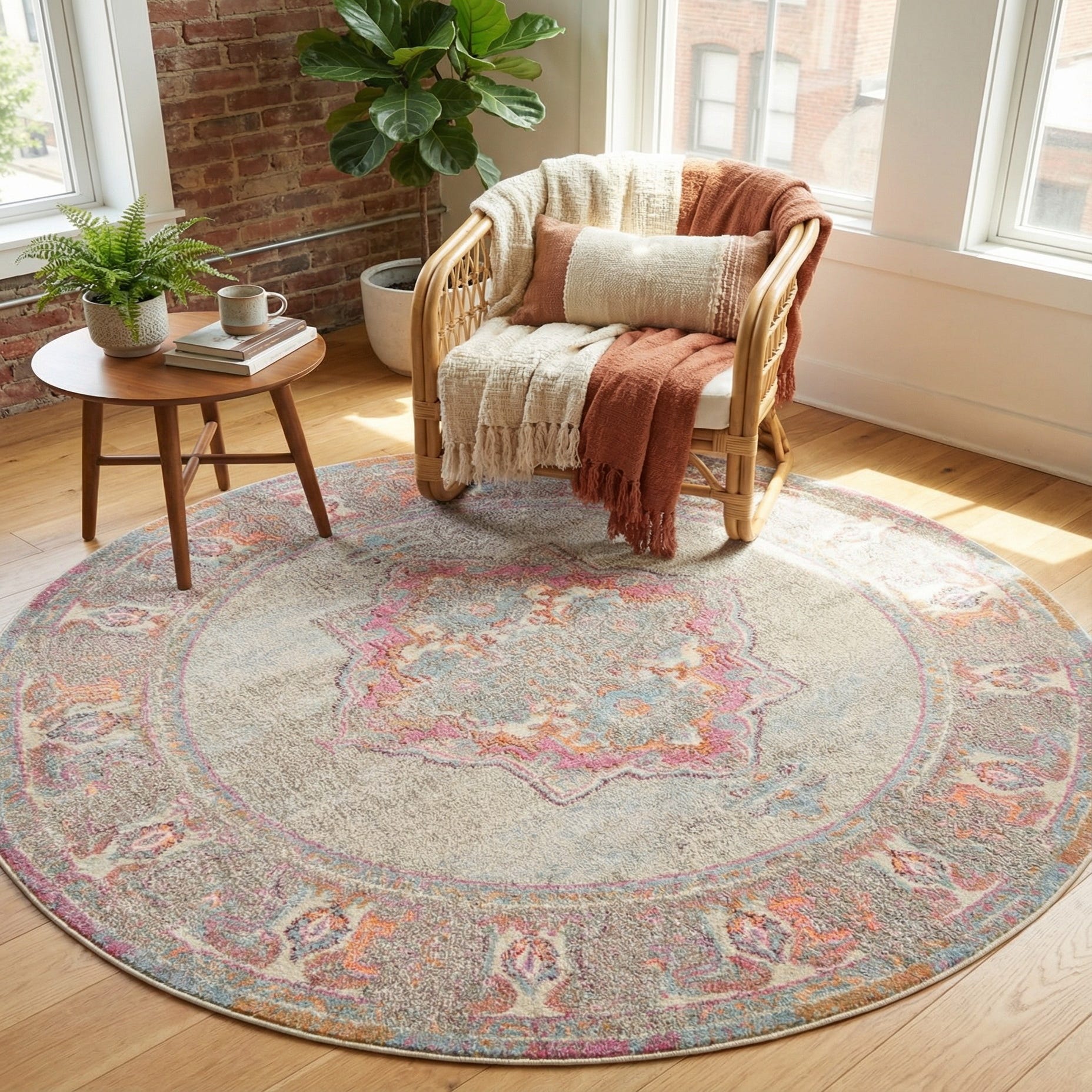 The polypropylene construction produces a low, dense pile with a smooth, slightly velvety hand that layers easily under furniture. It works beautifully in casual and transitional interiors: anchor a round dining table in a bright breakfast nook, soften a living room seating area in a cottage or coastal scheme, or add color and pattern to a bedroom or eclectic home office. The mix of light blue, beige, brown, gray, light green, orange, puce, red and pink makes it versatile for both muted and more colorful decor palettes.