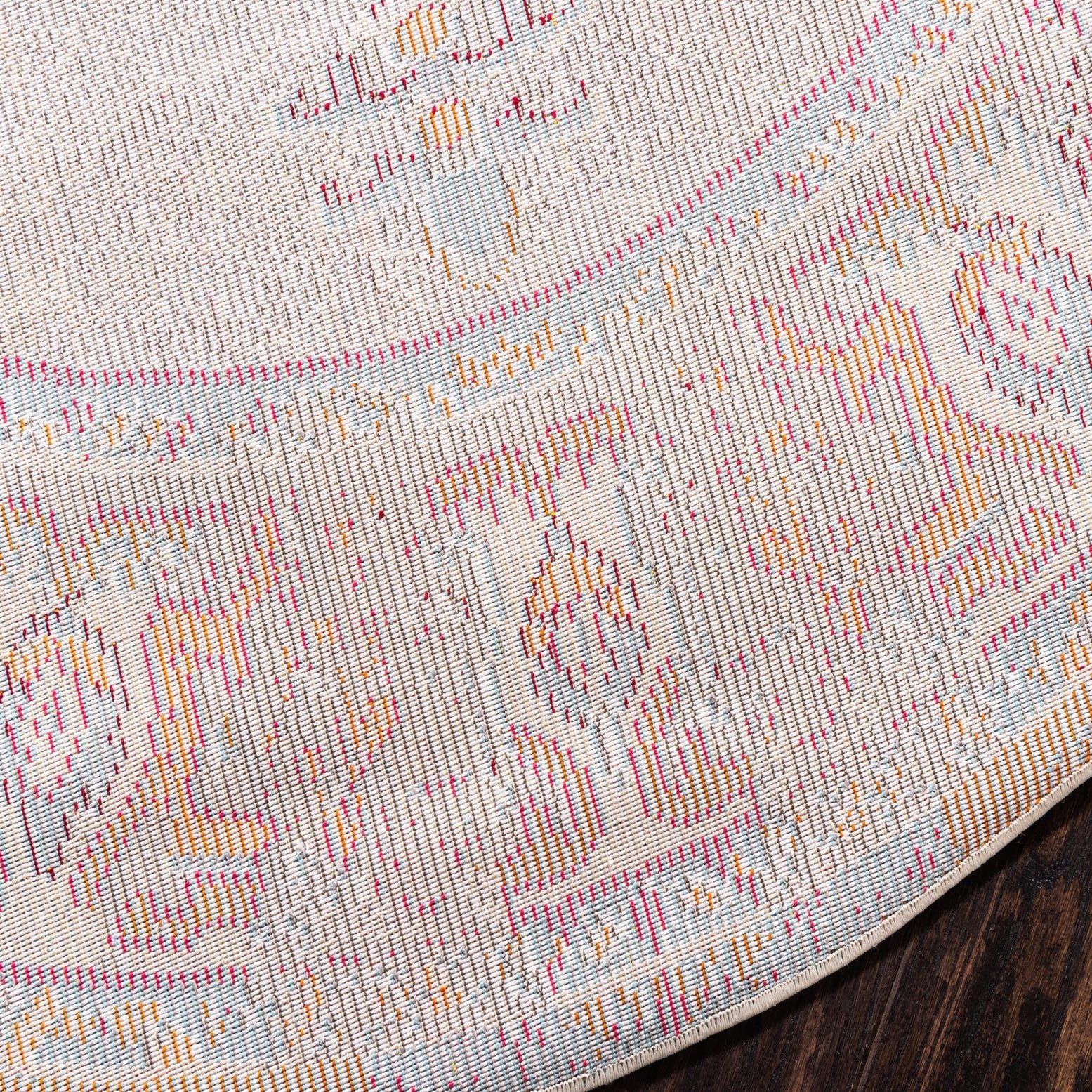 A round, machine-made rug in 100% polypropylene with a classic medallion layout set against a light blue background. The central ornate medallion blends pink, red and puce with touches of light green and soft blue, sitting on a beige-gray field that shifts into subtle brown and taupe tones. An outer border repeats stylized palmette motifs in orange, beige and gray, creating a gently worn, vintage-inspired appearance that balances color and pattern without overwhelming a room.