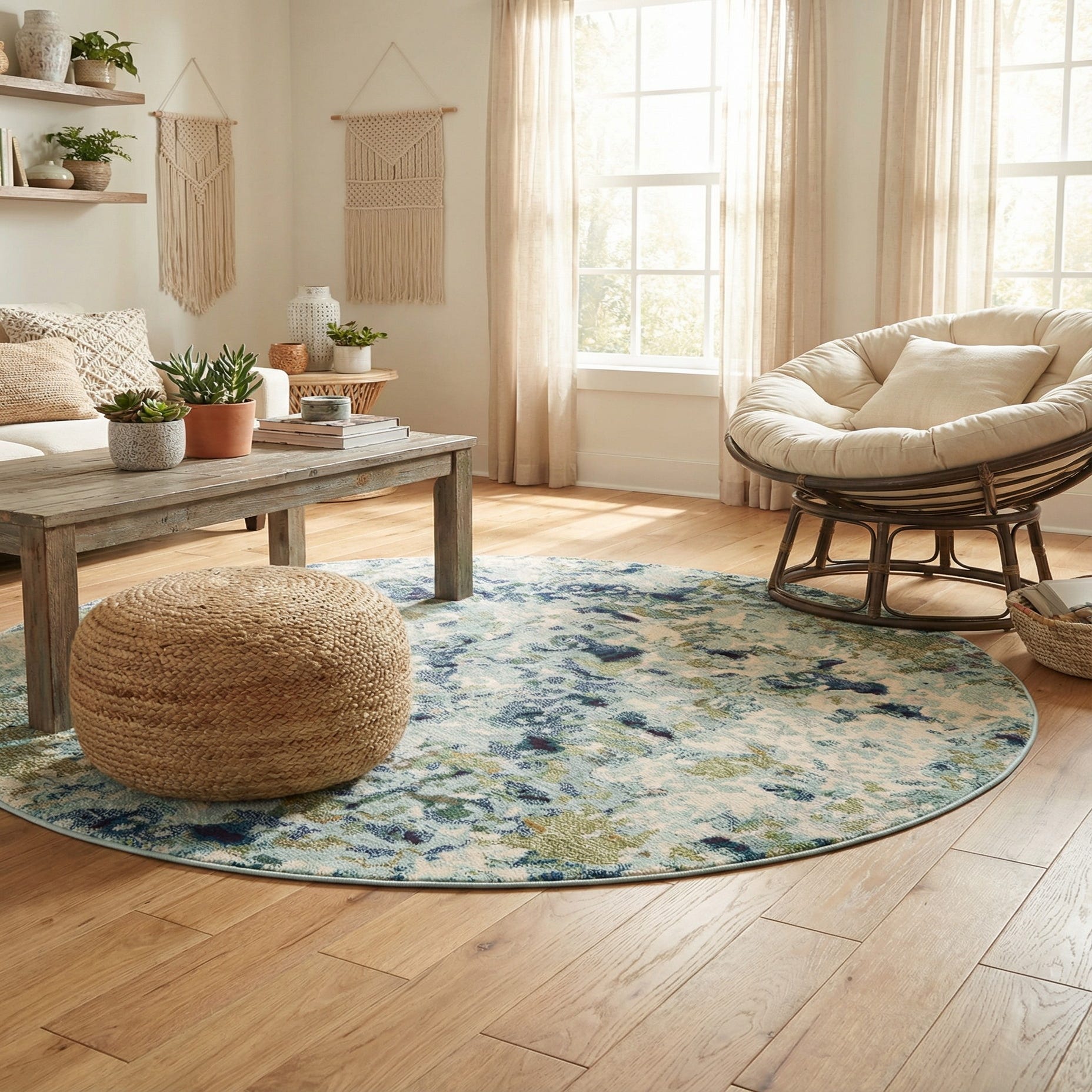 This palette and style work equally well in coastal, contemporary, or transitional rooms. Place it beneath a round dining table to echo the shape, anchor a cozy reading nook with a chair and side table, or layer it under a sofa in a light, airy living room paired with natural wood and linen textiles. Navy accents or houseplants will pick up the deeper tones and green highlights, while ivory and cream furnishings will let the light-blue background feel calm and refreshing.