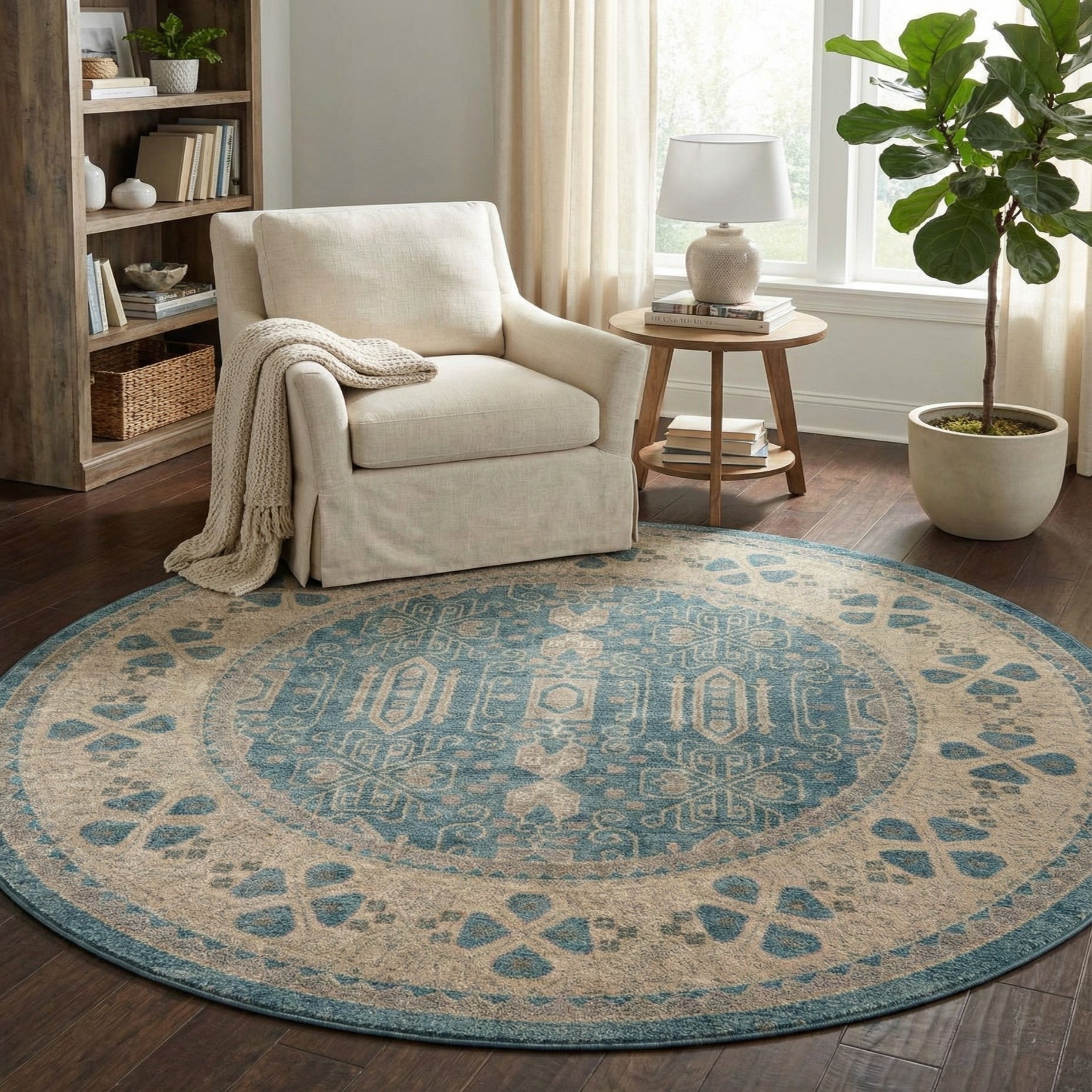 Stylistically it works well in coastal, cottage, or transitional interiors. Use it to anchor a round dining setup, soften a conversation area beneath a coffee table, or add color and pattern to an entryway or bedroom. The light blue ground brightens neutral palettes while the gray and ivory accents complement painted furniture, natural wood tones, and soft linen upholstery.