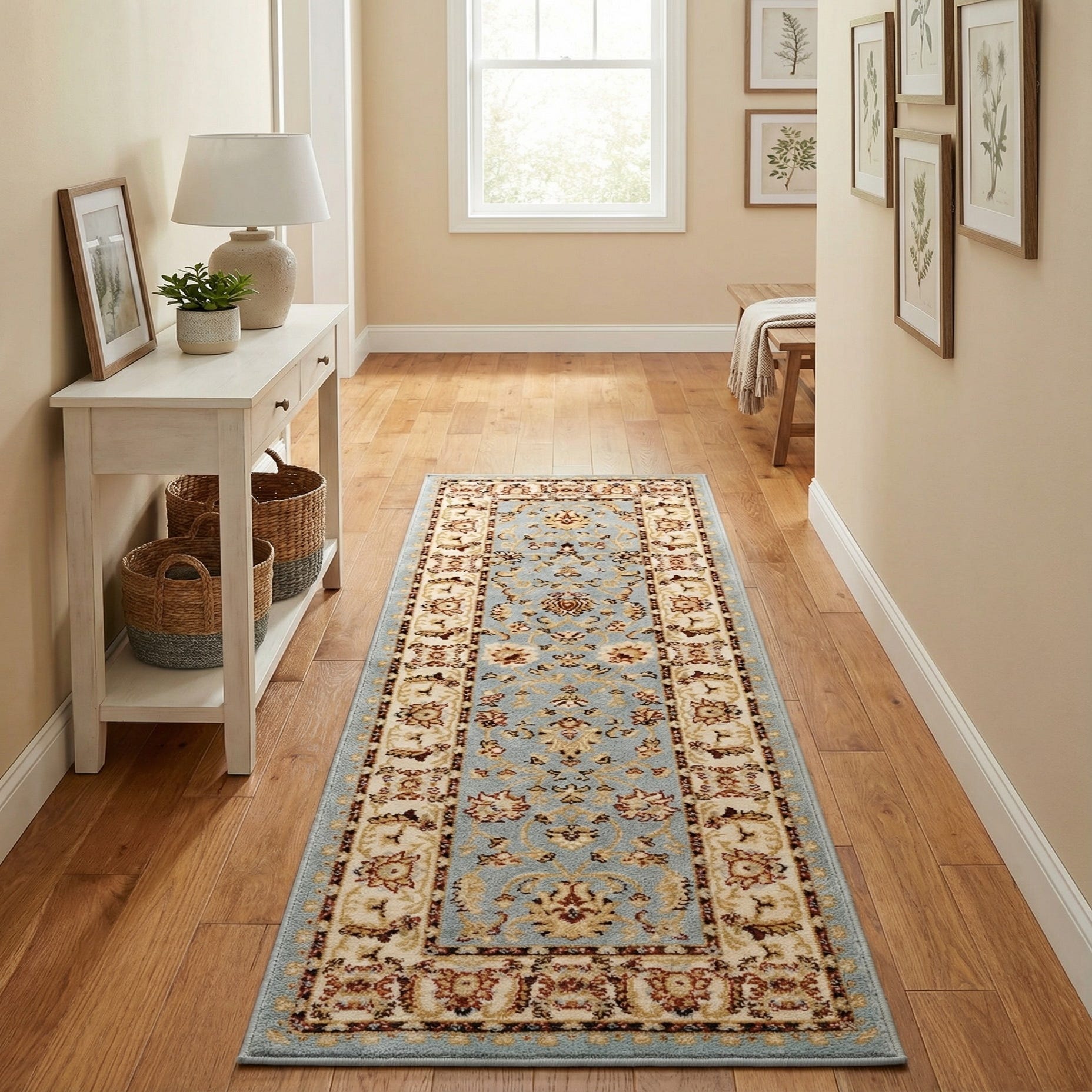 Machine-made from 100% polypropylene, the construction delivers consistent color and pattern—well suited for narrow spaces where a runner makes an impact. Use it in entry halls or along a corridor to introduce color and pattern, place it in front of a kitchen island or pantry for a touch of traditional style, or layer it in a transitional living space to anchor a console or bench. It pairs especially well with warm wood floors, painted cabinetry in neutral or muted tones, and furniture with classic or cottage-inspired lines.