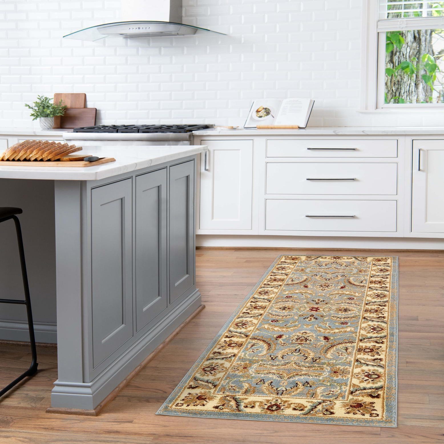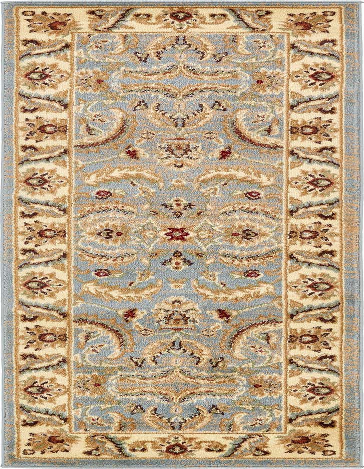 Primary color is Light Blue. Colors in this rug include: Light Blue, Brown, Cream, Green, Red, Rust Red, Tan.