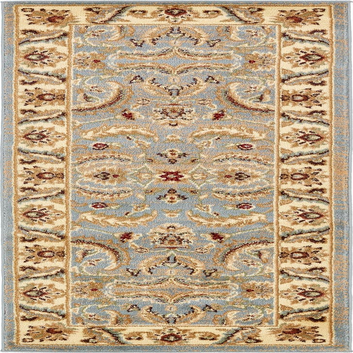 Primary color is Light Blue. Colors in this rug include: Light Blue, Brown, Cream, Green, Red, Rust Red, Tan.