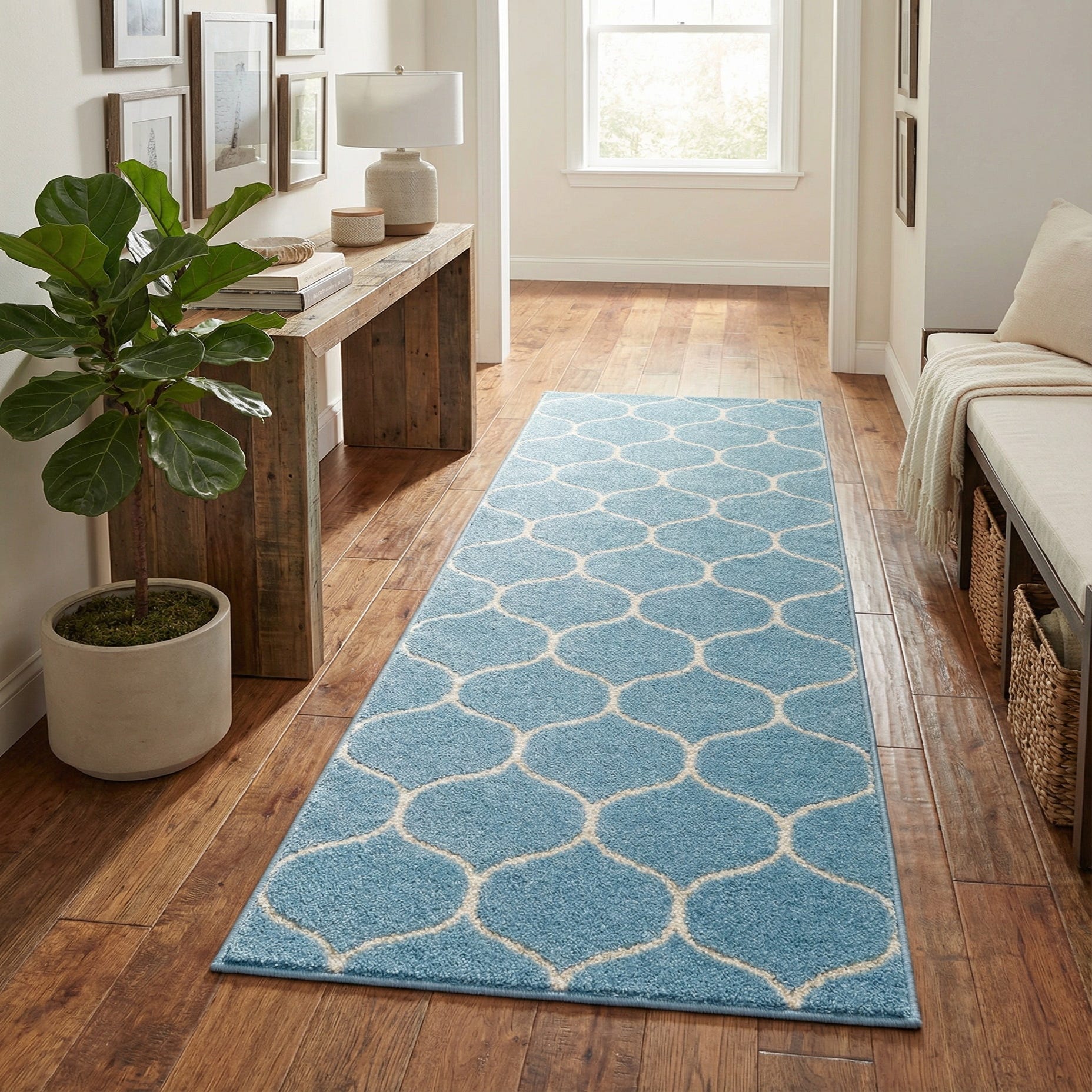 This runner works well in narrow circulation zones—hallways, entryways, galley kitchens, or along a stair landing—where it will introduce color without overwhelming the space. Pair it with white trim and natural wood tones for a coastal or contemporary feel, use it to soften crisp, modern furnishings, or layer it in a light, transitional interior to add pattern and warmth.