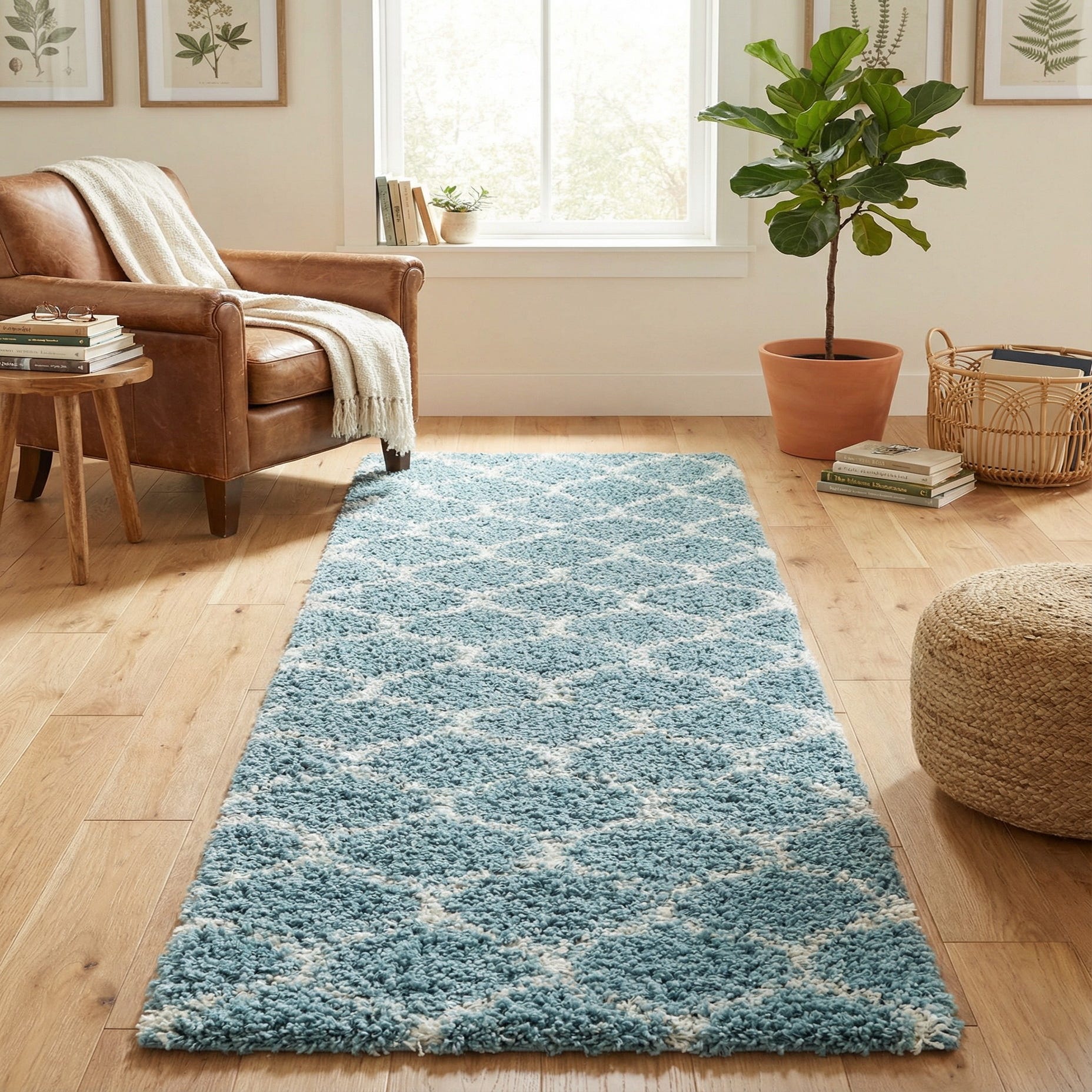 Low, geometric trellis lines in ivory trace a classic lattice pattern across a light blue field, giving this shag runner a calm, structured look. The high-pile, plush texture invites bare feet—each step sinks slightly into the soft polypropylene fibers while the shag surface adds visual depth and a touch of casual comfort. Machine-made from 100% polypropylene, the construction keeps the pile uniform and the pattern clearly defined.