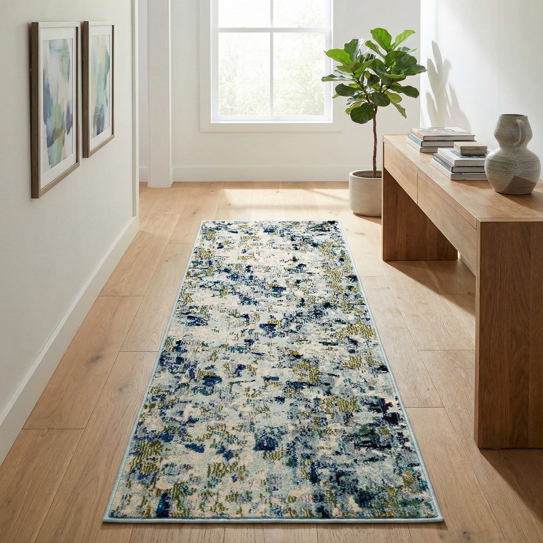 Place this runner in a bright hallway or narrow entry to introduce color without overpowering the space, or use it alongside light-wood floors and neutral upholstery to add depth and visual interest. It also pairs well with coastal, contemporary, or transitional interiors—think linen sofas, navy accent pillows, woven baskets, or subtle brass hardware—to reinforce the rug’s cool palette and relaxed, modern character.