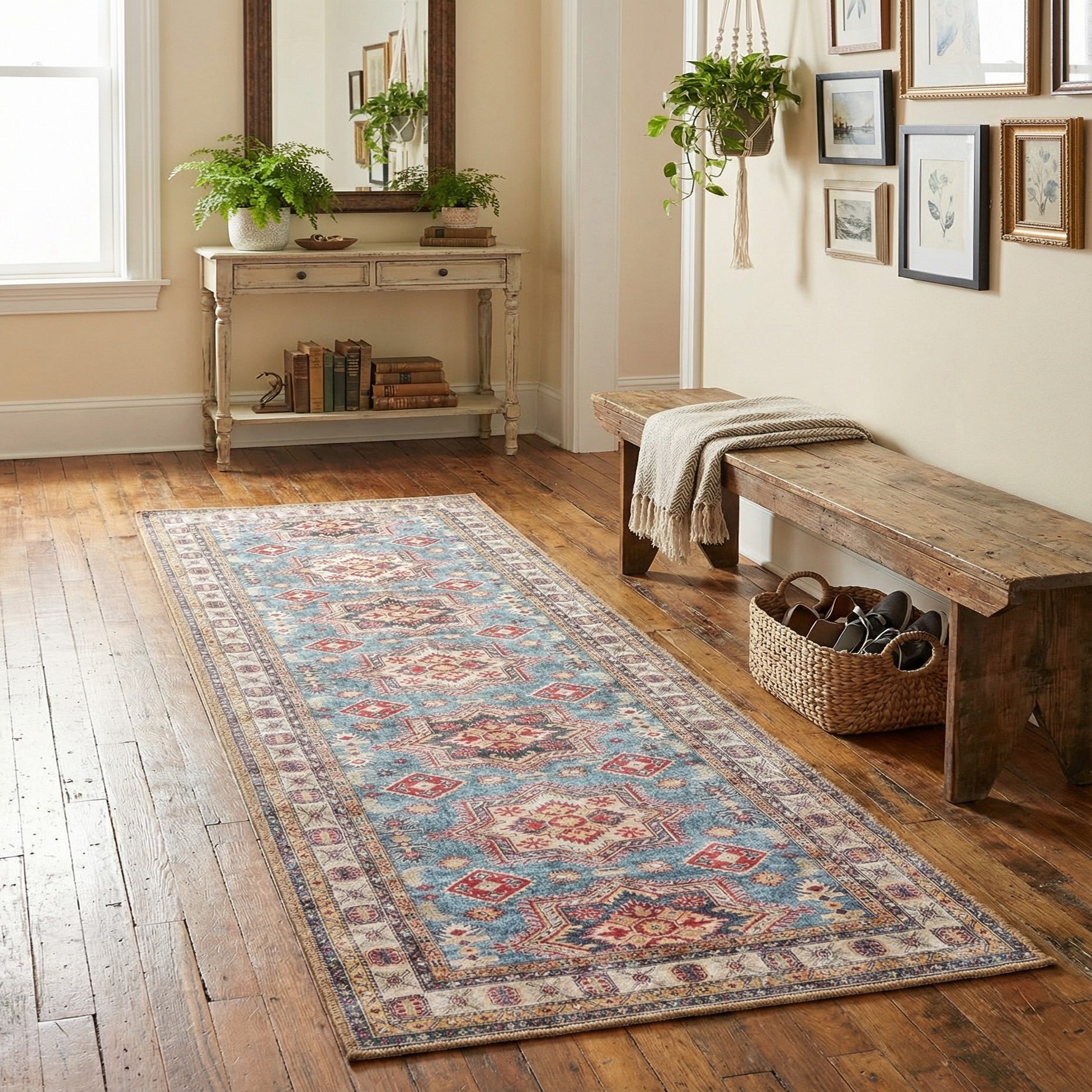 A 6 ft runner rug featuring a traditional Oriental medallion pattern in shades of blue, red, and cream.