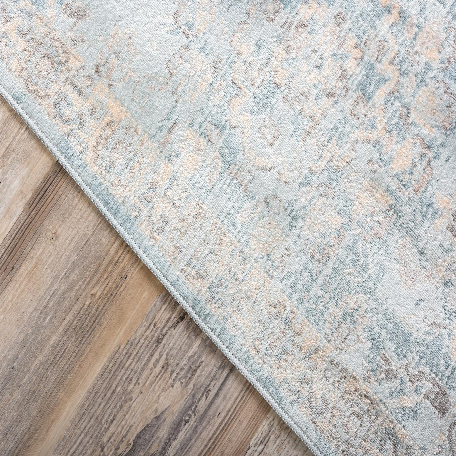 A softly distressed, vintage-inspired pattern unfolds across a light blue background, where faded medallions and floral scrollwork create a layered, lived-in look. Accents of beige, deeper blue and tan thread through the design, giving the ornamentation just enough contrast to read against the pale field without overpowering it. Machine-made of 100% polypropylene, the piece has a low, even pile with a smooth hand and a subtle sheen that reflects the detailed pattern and helps the colors sit softly together.
