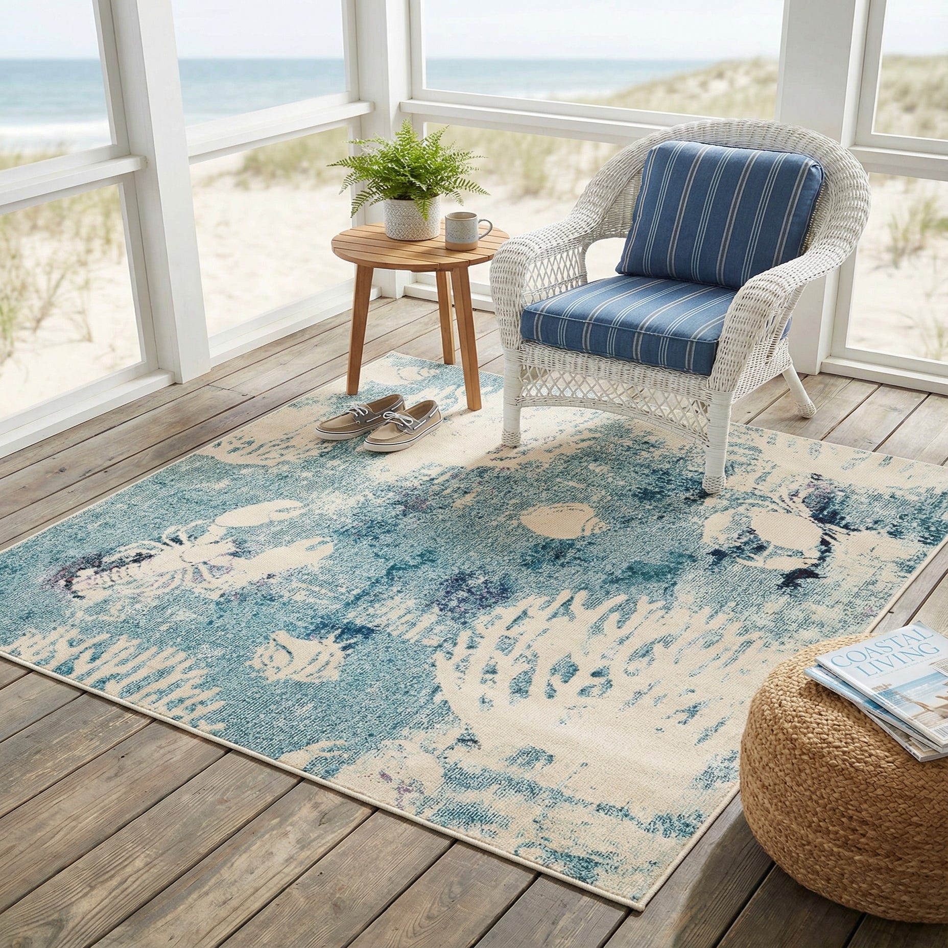 Its stain-resistant quality makes it an ideal choice for high-traffic areas or dining spaces where spills are a concern. The rug's pattern and color palette are versatile, allowing it to complement a range of interior design styles, from coastal to contemporary or even minimalist settings seeking a splash of color. Whether anchoring a living room, enhancing an office, or adding character to a bedroom, this rug can effortlessly integrate into various decors while withstanding daily wear and tear.