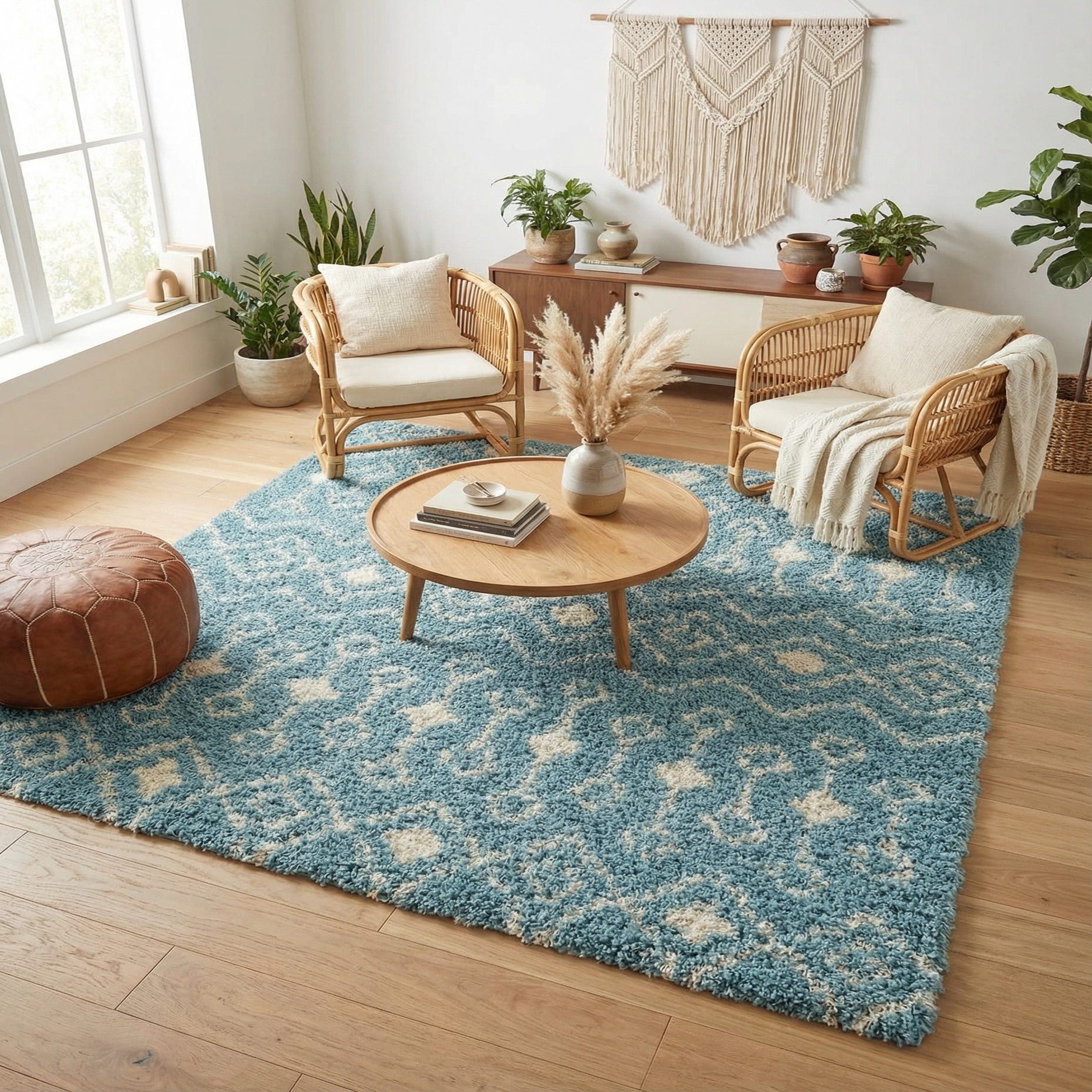 Machine made from 100% polypropylene, this rug works well in laid-back, lived-in spaces where comfort and easy care are priorities. Use it to anchor a cozy seating area or reading nook, layer it over hardwood floors in a coastal or cottage-style living room, or place it in a bedroom to soften the space and introduce a calm, airy palette. Its color and pattern also complement bohemian and transitional interiors, pairing nicely with natural wood tones, woven textures, and light neutral upholstery.