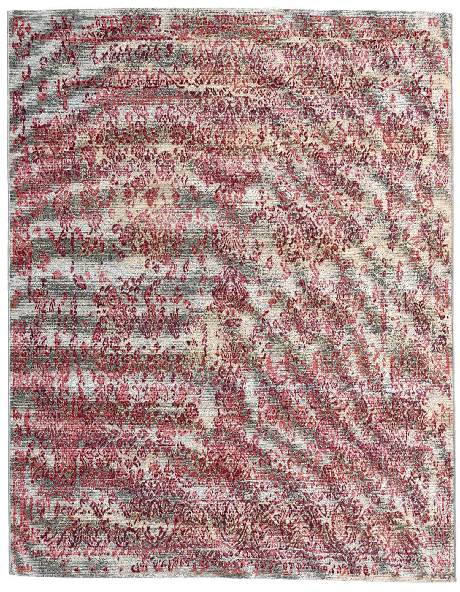 Primary color is Light Blue. Colors in this rug include: Light Blue, Beige, Burgundy, Red.