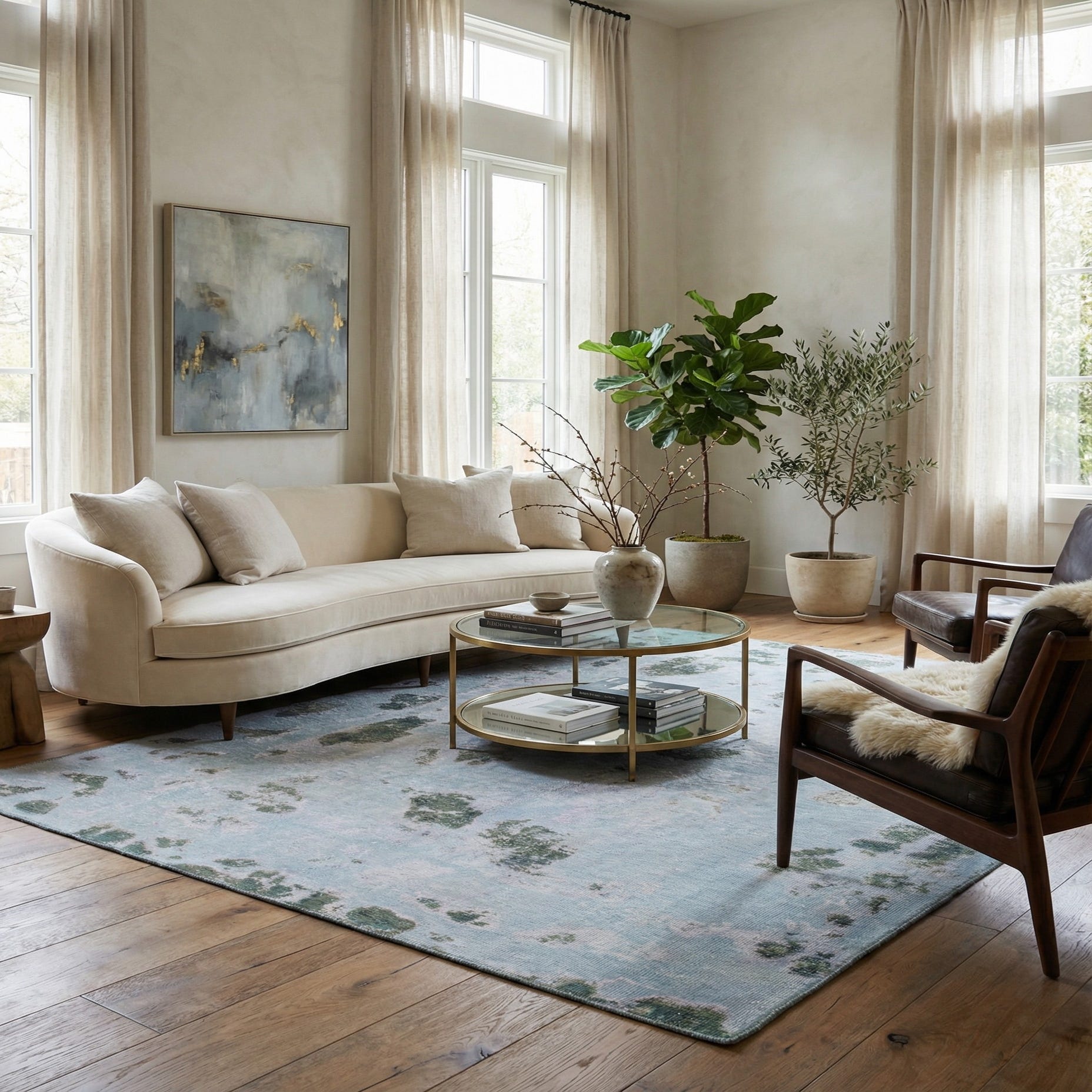 A 5' 9 x 7' 0 square light blue wool rug with an abstract, distressed vintage pattern in darker blue tones.