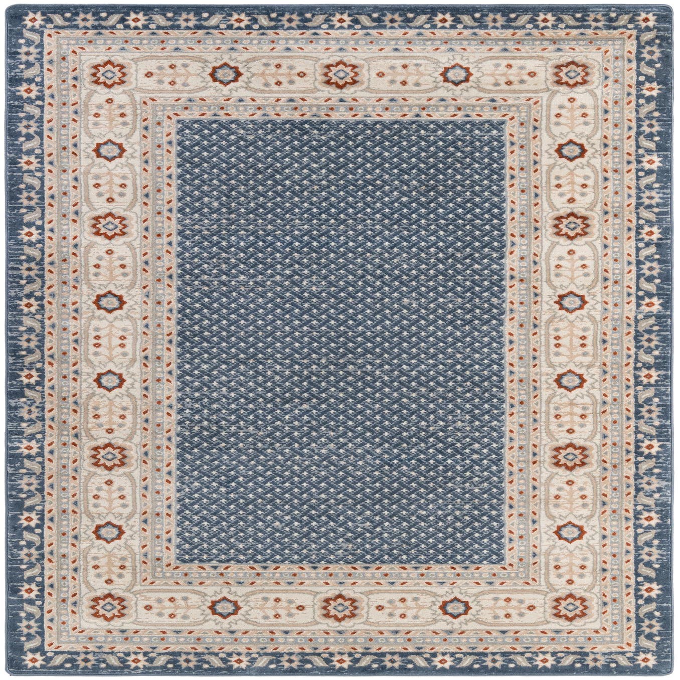A 6x9 rectangular Charlotte Collection rug with a light blue modern geometric center and a cream border with floral motifs.