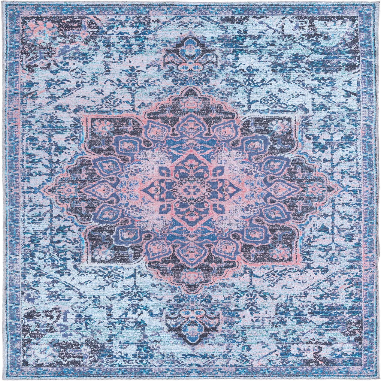 Primary color is Light Blue. Colors in this rug include: Light Blue, Black, Navy Blue, Green, Pink.