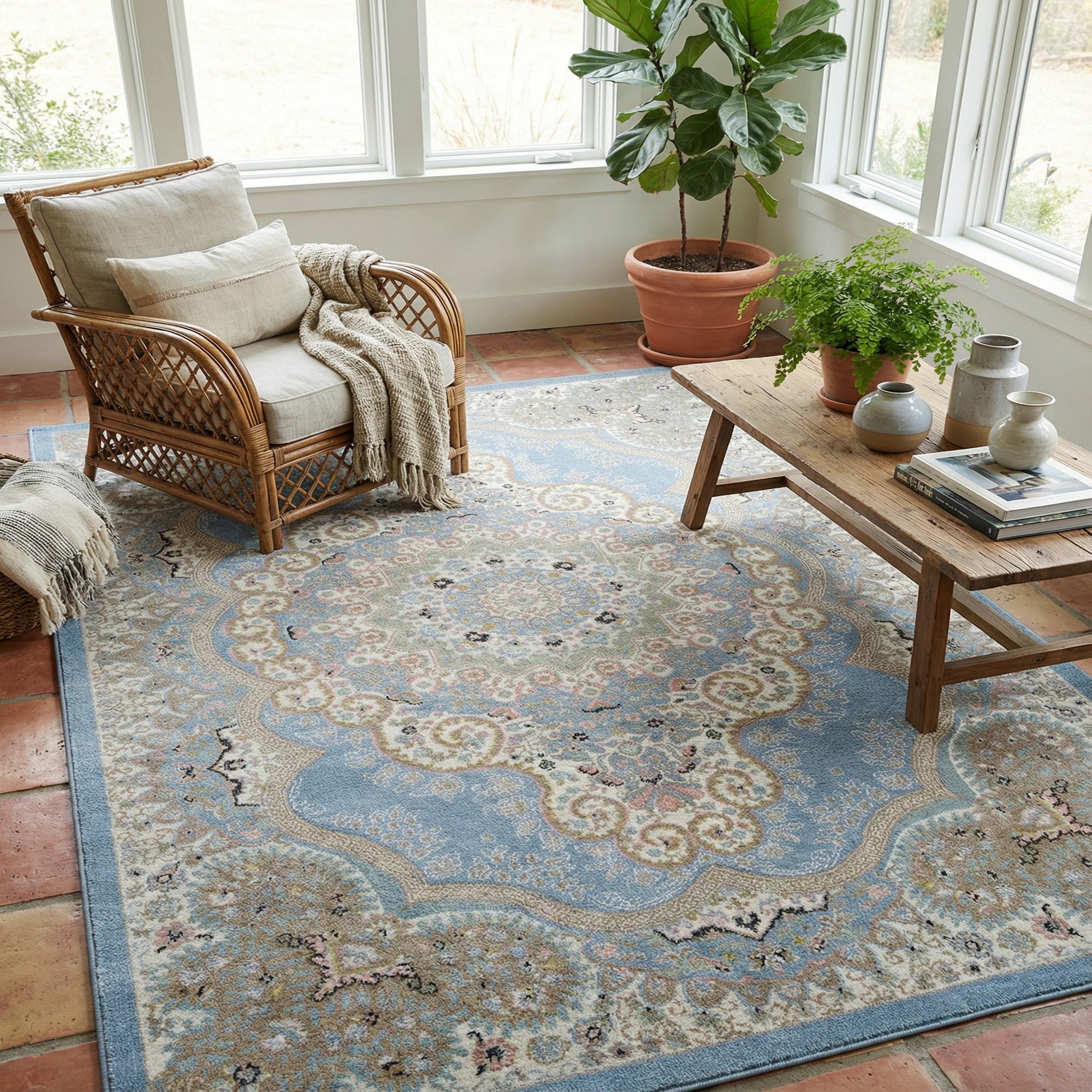 Primary color is Light Blue. Colors in this rug include: Light Blue, Beige, Ivory, Light Green, Pink.