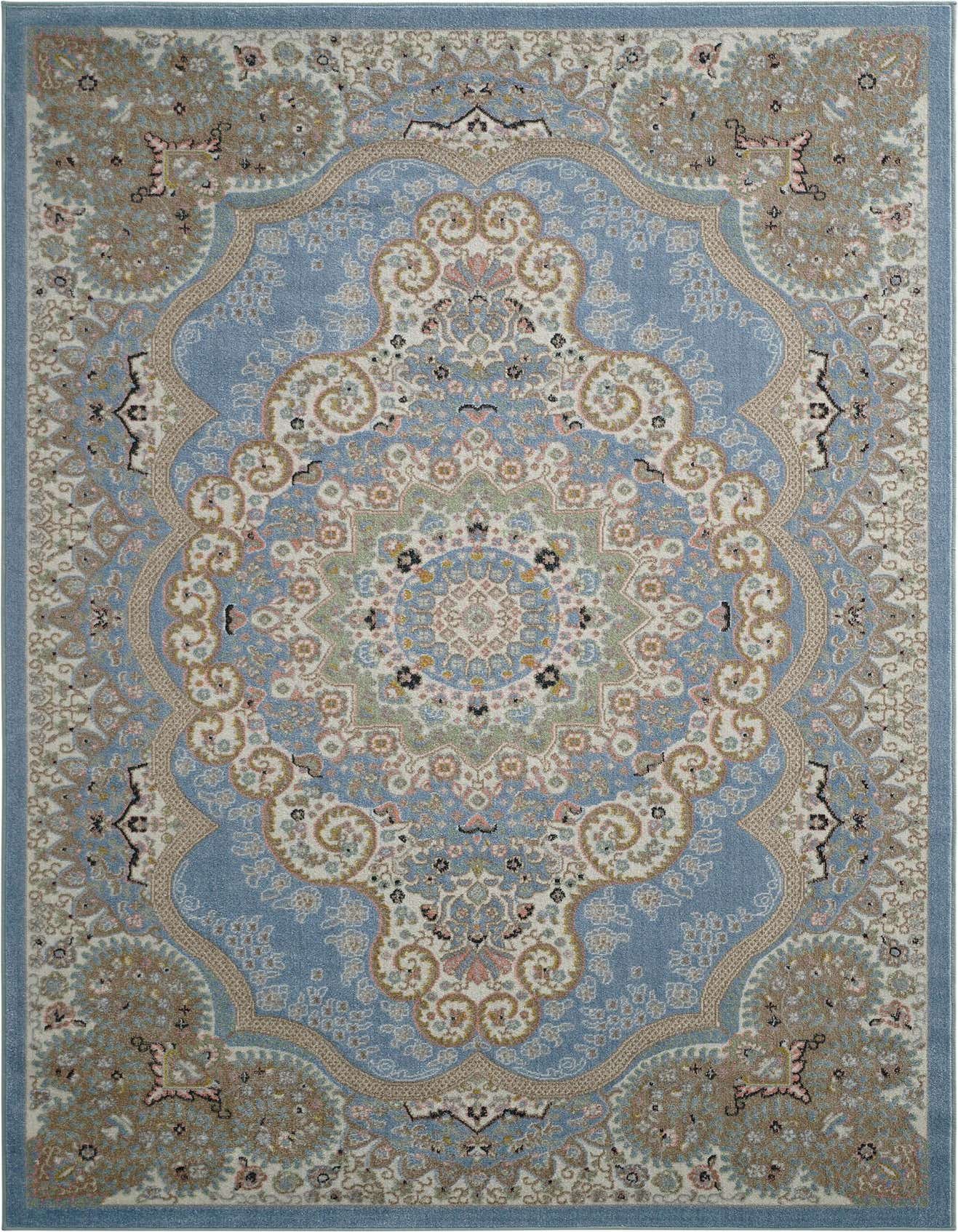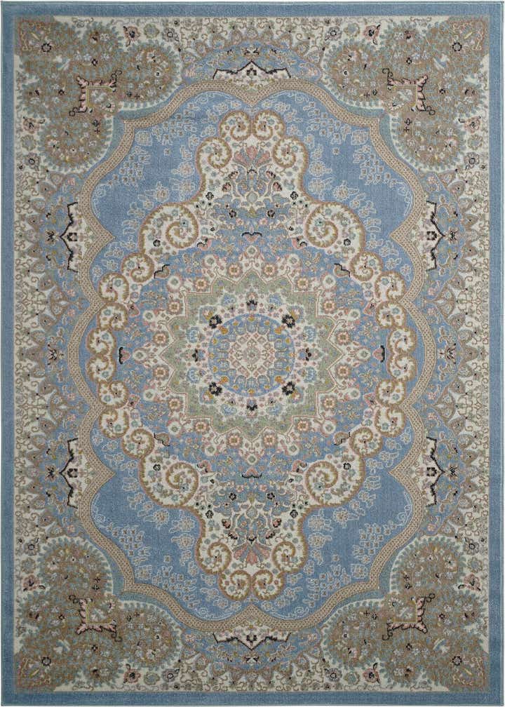 Primary color is Light Blue. Colors in this rug include: Light Blue, Beige, Ivory, Light Green, Pink.