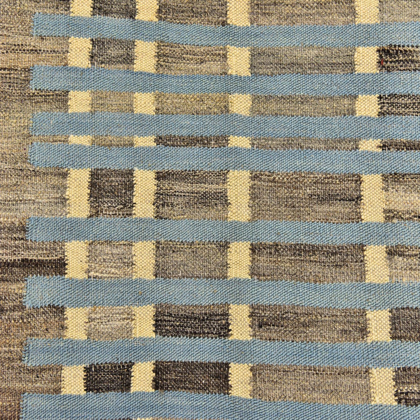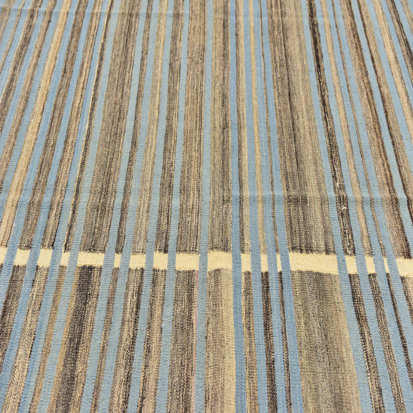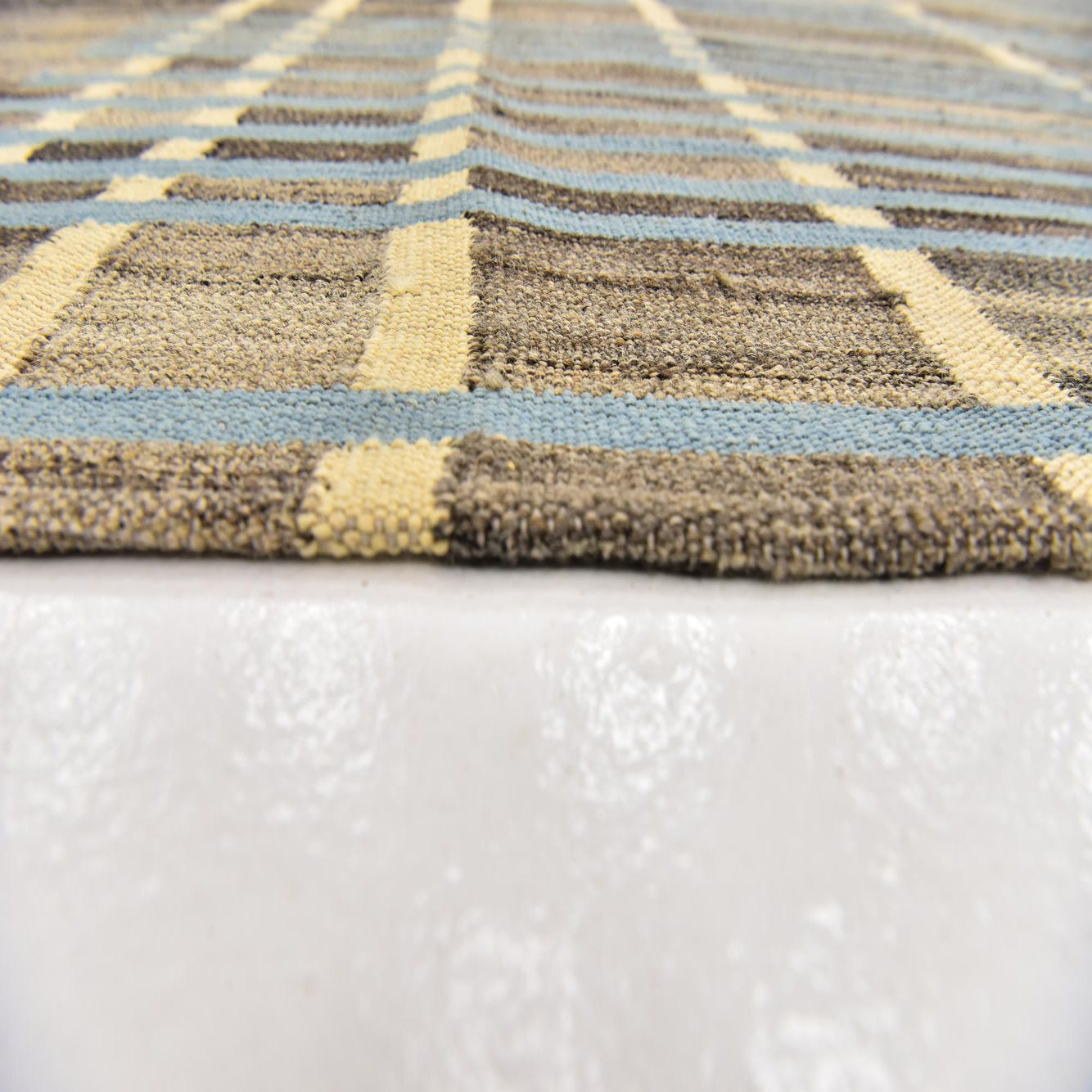 The Kilim Modern collection presents a hand-woven 6x9 rug crafted from 100% wool, displaying a light blue background accented by a pattern featuring cream and light brown colors. The linear design lends itself to a contemporary style with its clean, graphical layout. The texture of this weave adds depth and a tactile quality to the surface, inviting a sensory experience to enhance any living space.
