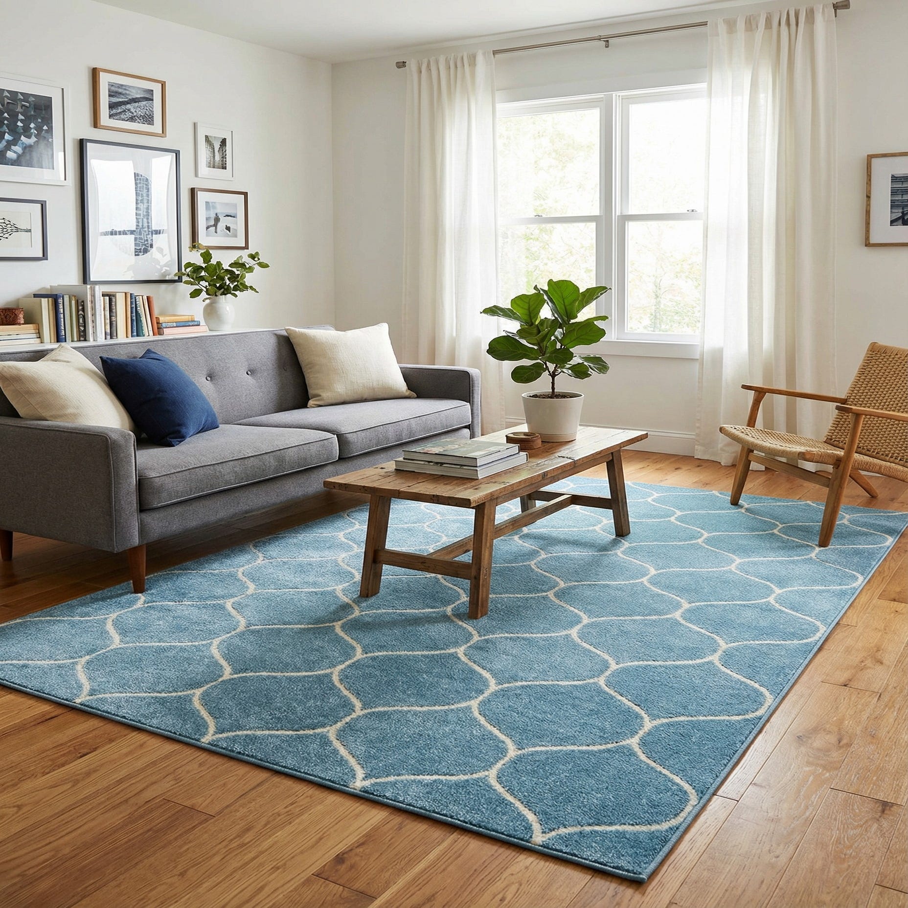 Run your hand over the surface and you'll notice a plush, low-to-medium pile with a smooth, slightly lustrous finish that feels comfortable underfoot. Machine-made of 100% polypropylene, this rug holds its shape and lays flat in everyday rooms. It works well in coastal and beach-inspired living rooms, breezy bedrooms, nurseries, or casual dining areas—pair it with white or light-wood furniture, soft linens, and pale metallic accents for a relaxed, cohesive look.