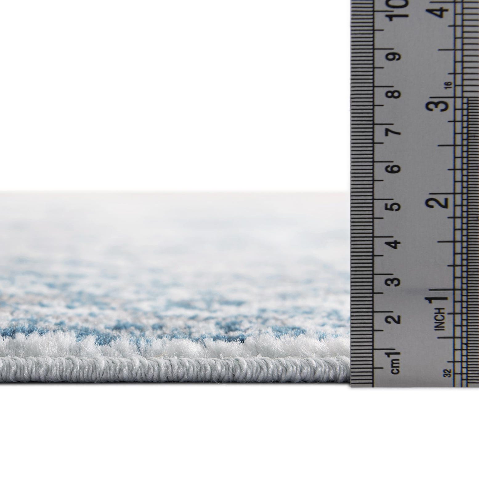 A softly distressed medallion and border motif rests on a light blue ground, with faded accents of blue, gray and ivory woven through the design. The pattern reads like a vintage find — floral and geometric elements that are intentionally weathered to create depth without heavy contrast. Machine made of 100% polypropylene, the rug has a low-profile pile that feels smooth to the touch and shows subtle textural variation where the motifs appear, giving the surface a lived-in, layered look.
