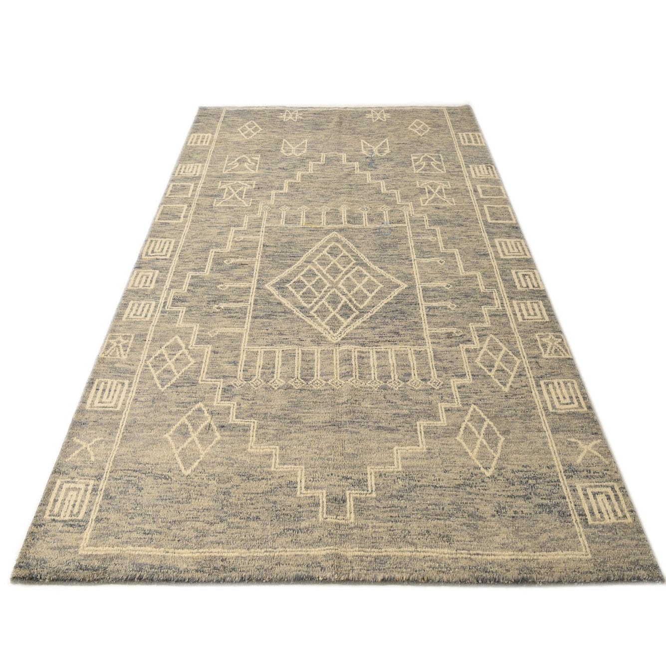 This Moroccan collection rug is a hand-knotted 6x9 piece crafted from 100% wool, offering a fusion of comfort and durable craftsmanship. The rug features a geometric pattern with traditional motifs that bring a sense of time-honored design to any space. The light blue background is complemented by gray and ivory accents, resulting in a serene color palette that can integrate seamlessly into a variety of interior design styles.