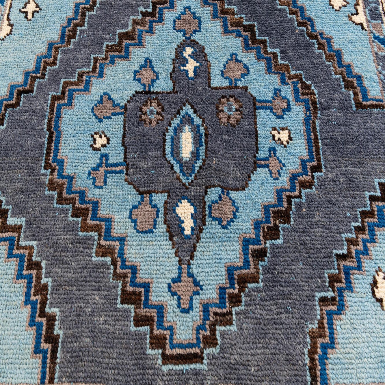 A 6x9 rectangular light blue and dark blue tribal wool rug with a central medallion and geometric patterns, ideal for a living room.