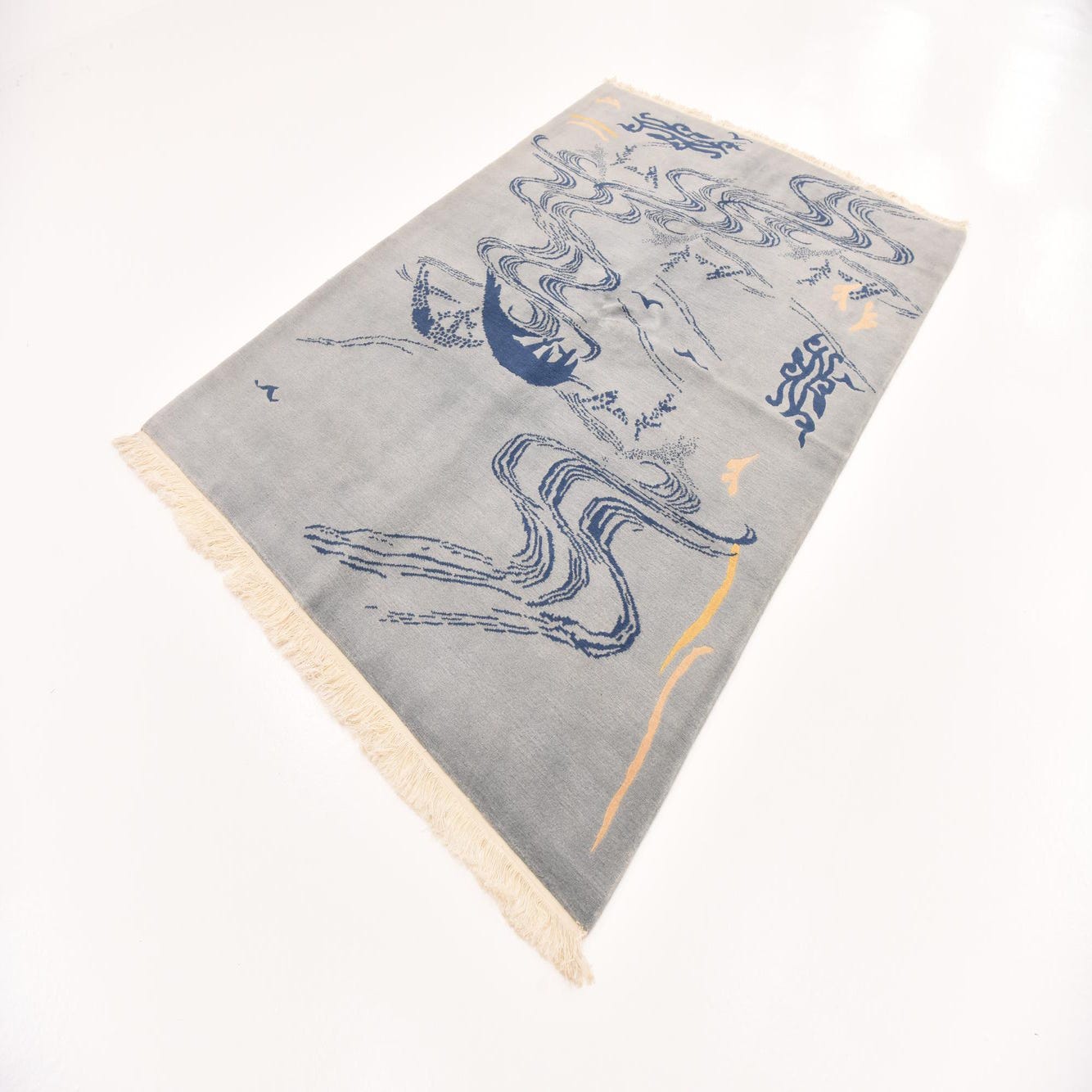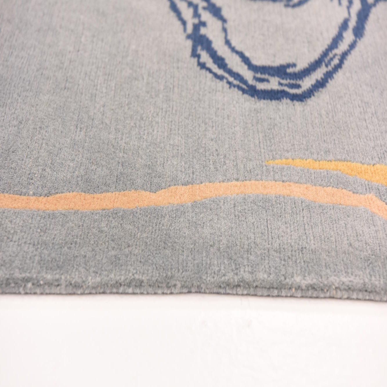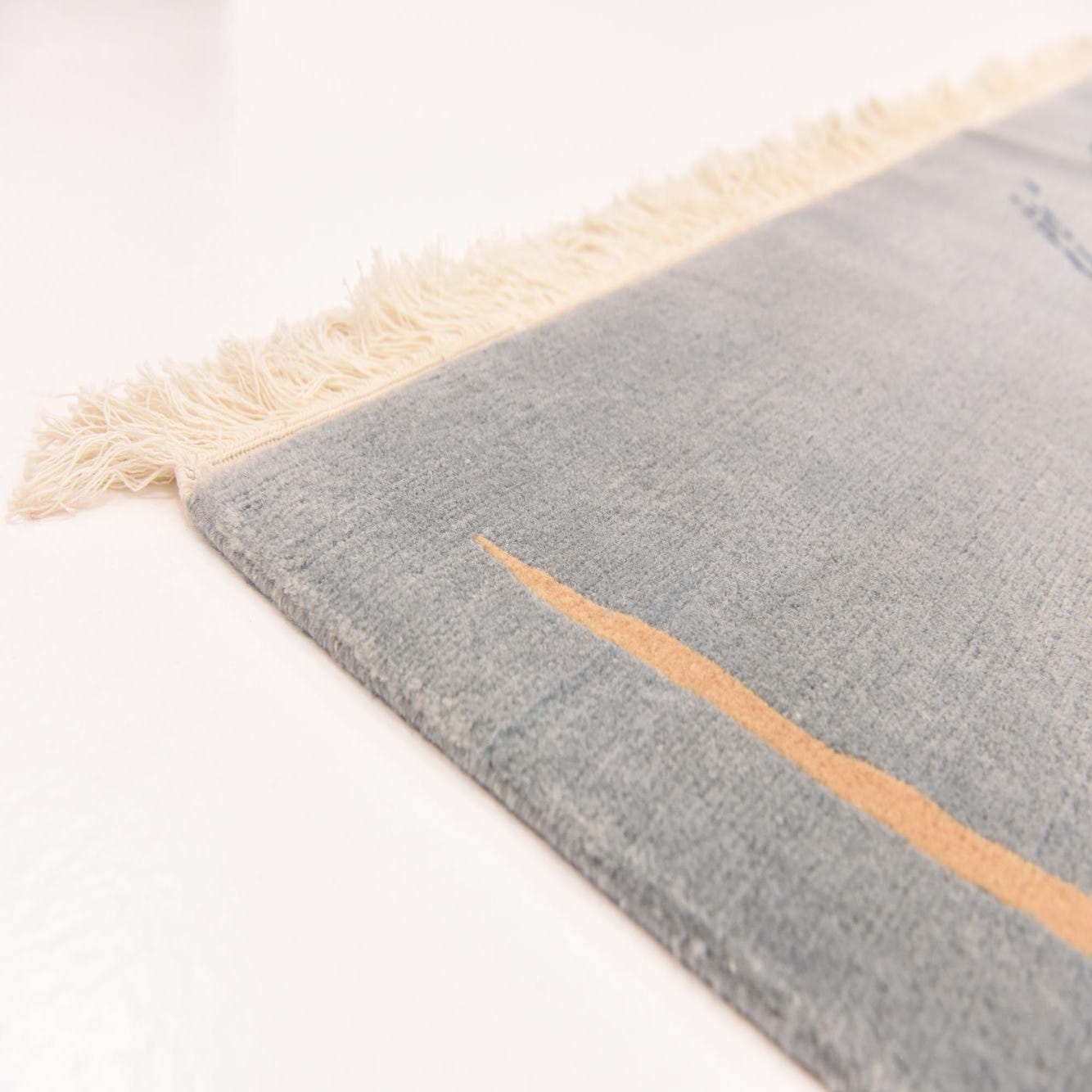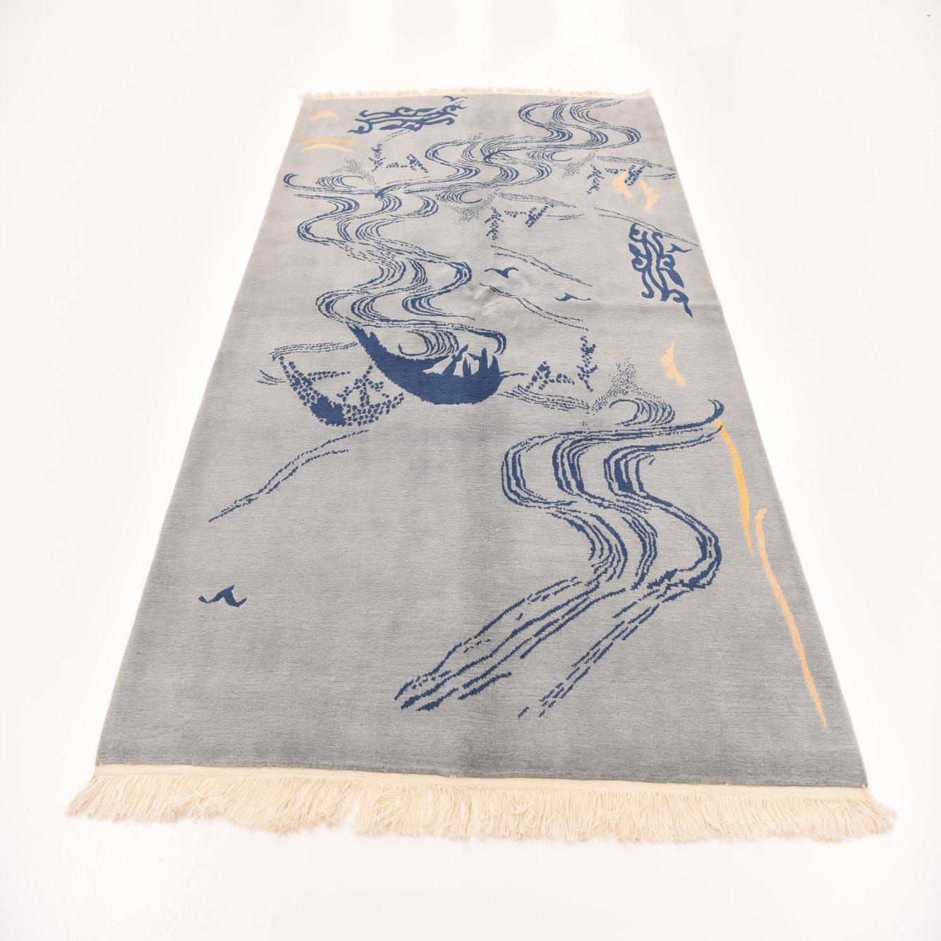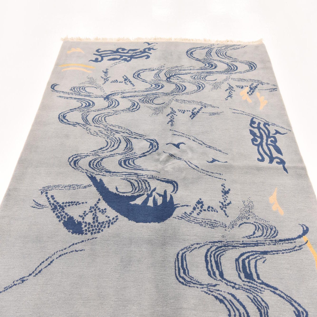 A 6x9 rectangular light blue wool rug with an abstract modern pattern featuring dark blue wavy lines, a stylized boat, and subtle orange accents, ideal for a living room or bedroom.