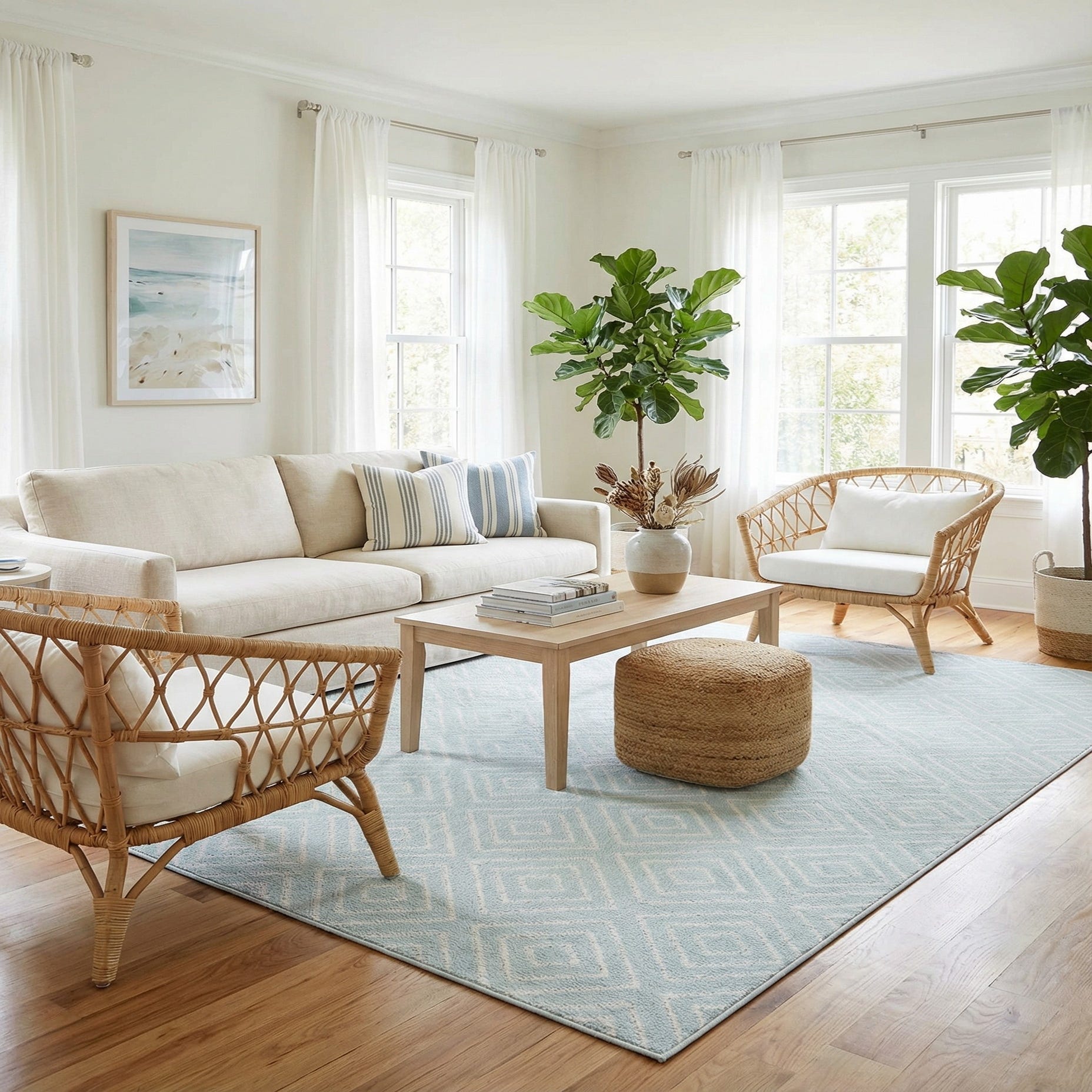 This rug works well on a covered patio, sunroom, or layered under a casual dining set, and pairs nicely with light woods, rattan, or white wicker for a coastal or cottage vibe. It also complements modern and transitional interiors when combined with crisp neutrals and soft linens, bringing a fresh, airy touch to living rooms, bedrooms, or outdoor seating areas.