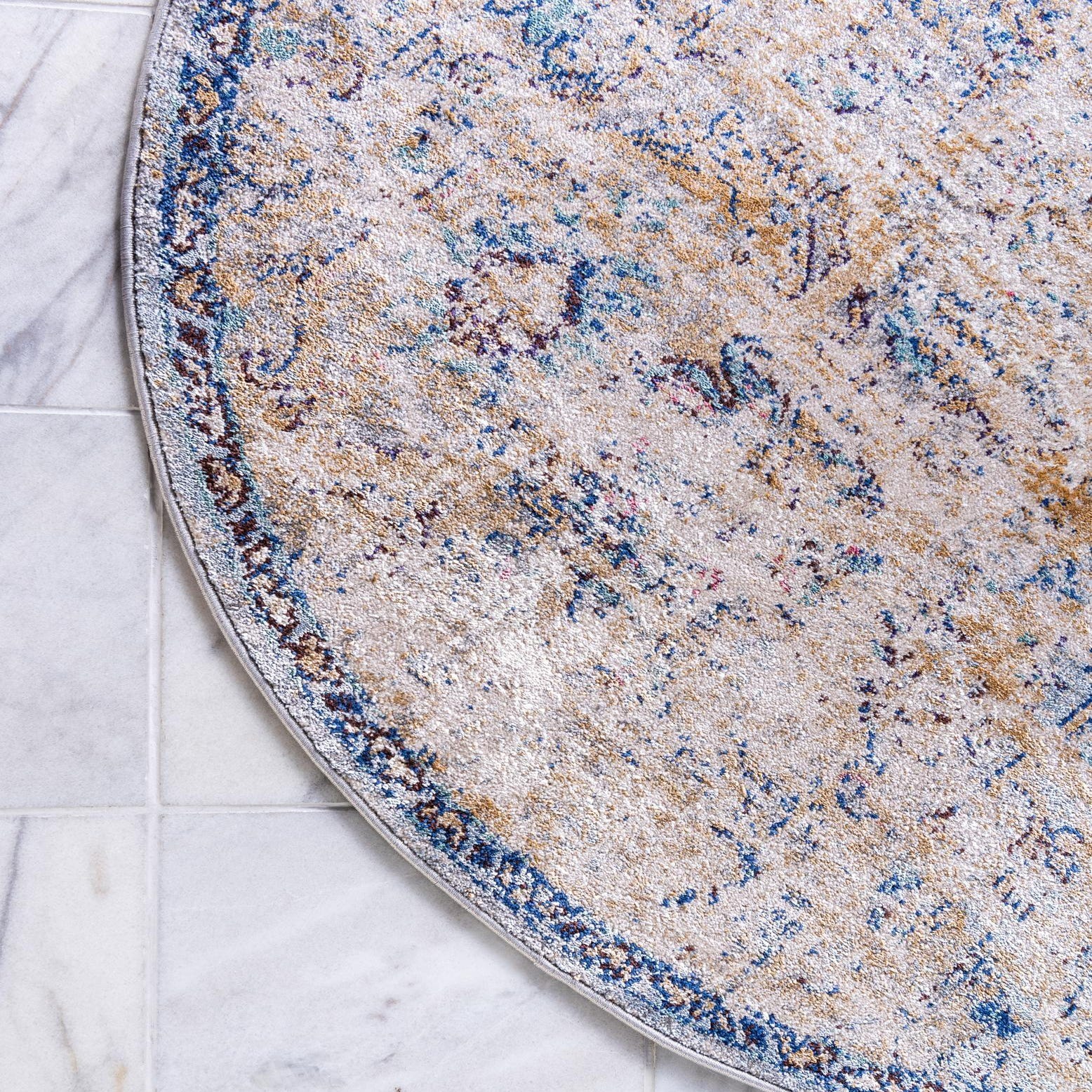 A softly faded, vintage-inspired floral pattern gives this round rug a relaxed, lived-in look. The light blue background provides a cool, airy base while tan, ivory and navy blue form the scrolling vines, medallion fragments and floral motifs; subtle brown and green accents add dimension and contrast. Machine-made from 70% polypropylene and 30% polyester, the rug has a low, dense pile with a soft hand and a gentle sheen that highlights the layered colorwork and distressed detailing.