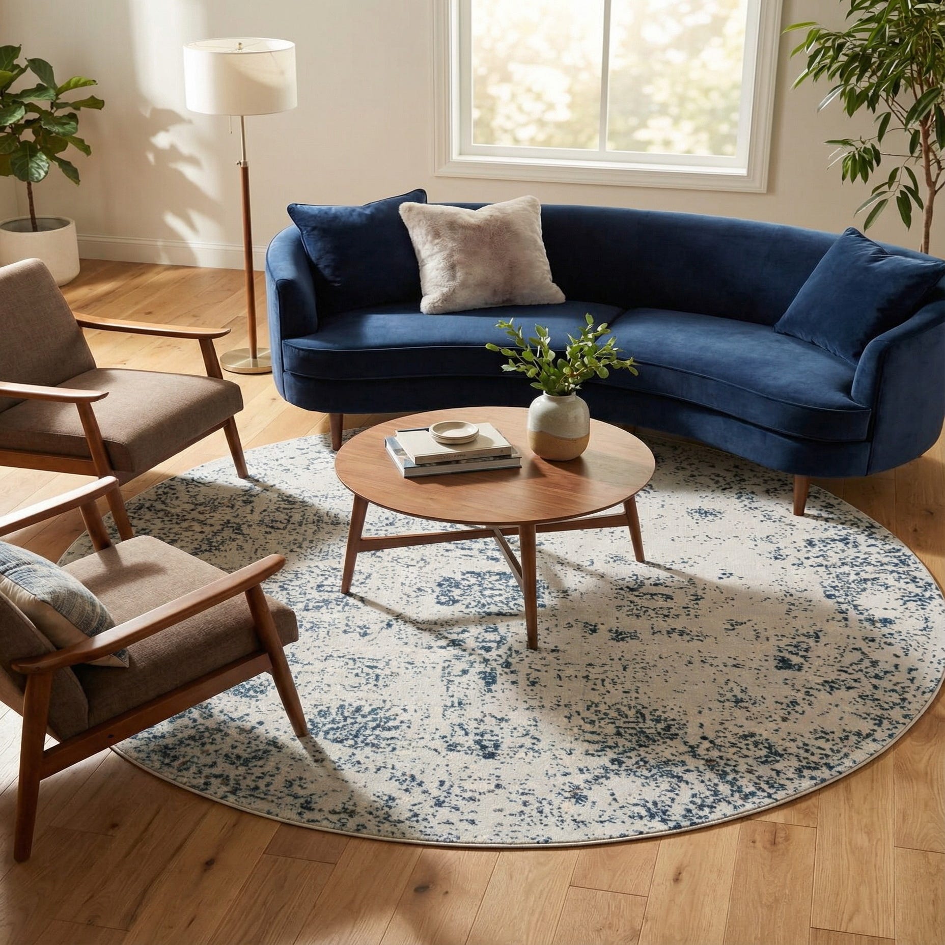 Machine-made from 100% polypropylene, the rug has a low-profile pile with a smooth, slightly supple hand underfoot. It works well beneath a round dining table, or layered in a seating area to soften hardwood or tile. Pair it with light woods and linen upholstery for a coastal or modern farmhouse scheme, or use it in a transitional living room alongside navy accents and clean-lined furniture to bring a subtle touch of pattern without overwhelming the room.