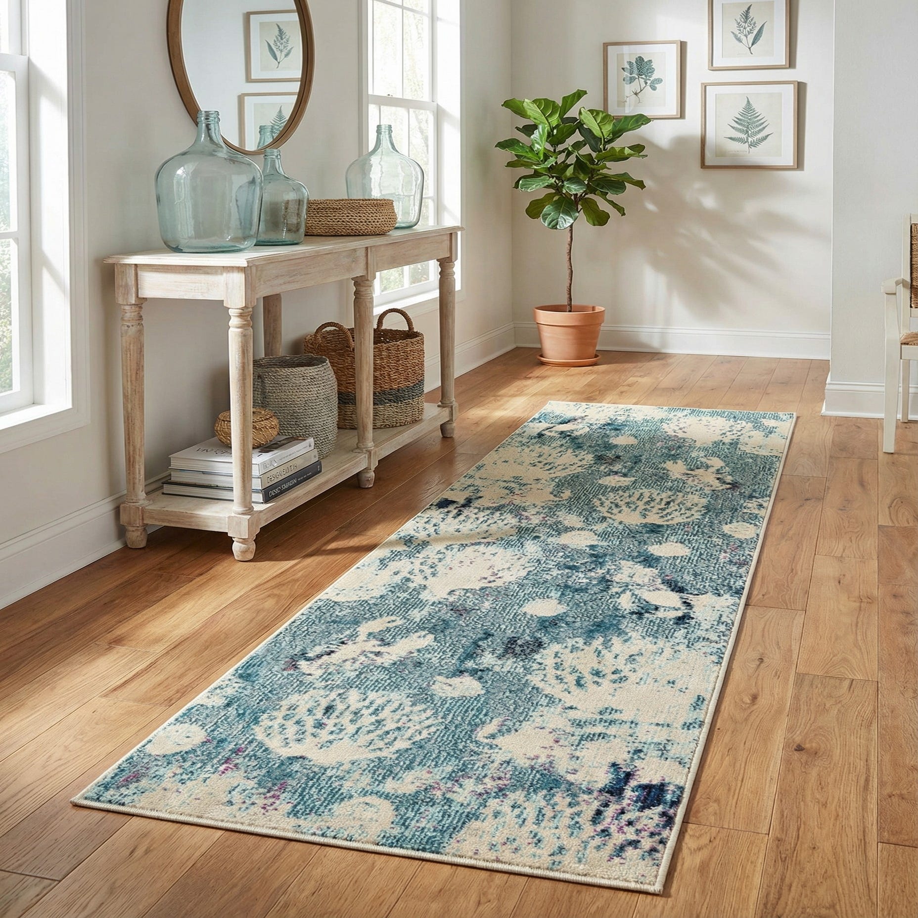This runner works well in narrow, active spaces where you want color and pattern without heavy visual weight — think hallways, entryways, or a kitchen galley. It also pairs nicely with coastal or transitional interiors: place it on light wood floors beside white or beige furnishings, layer it against navy throw pillows and warm metal accents, or use it to add a gentle color lift in a contemporary bedroom.