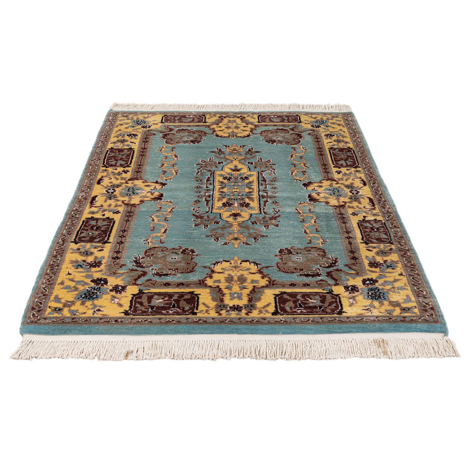 Primary color is Light Blue. Colors in this rug include: Light Blue, Ivory, Yellow, Maroon.