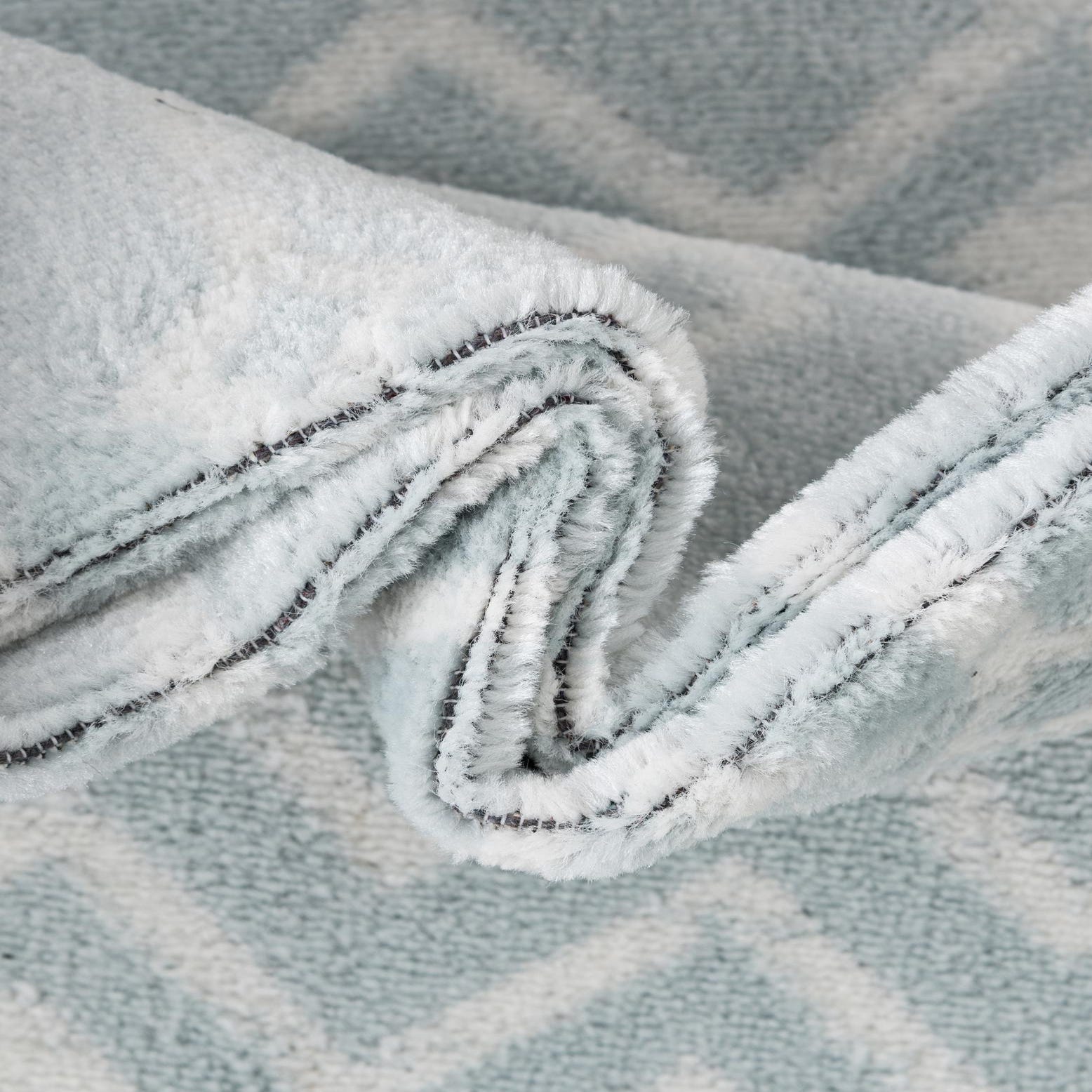 Soft light blue sets the background for a repeating ivory trellis of diamonds and linked vertical motifs, giving this runner a calm, geometric presence. The pattern is rendered with a subtle sculpted effect so the ivory design sits slightly raised against the light-blue field, creating a tactile, low-pile surface that feels plush underfoot. Machine made from 100% polypropylene, the construction keeps edges neat and the pattern well-defined.