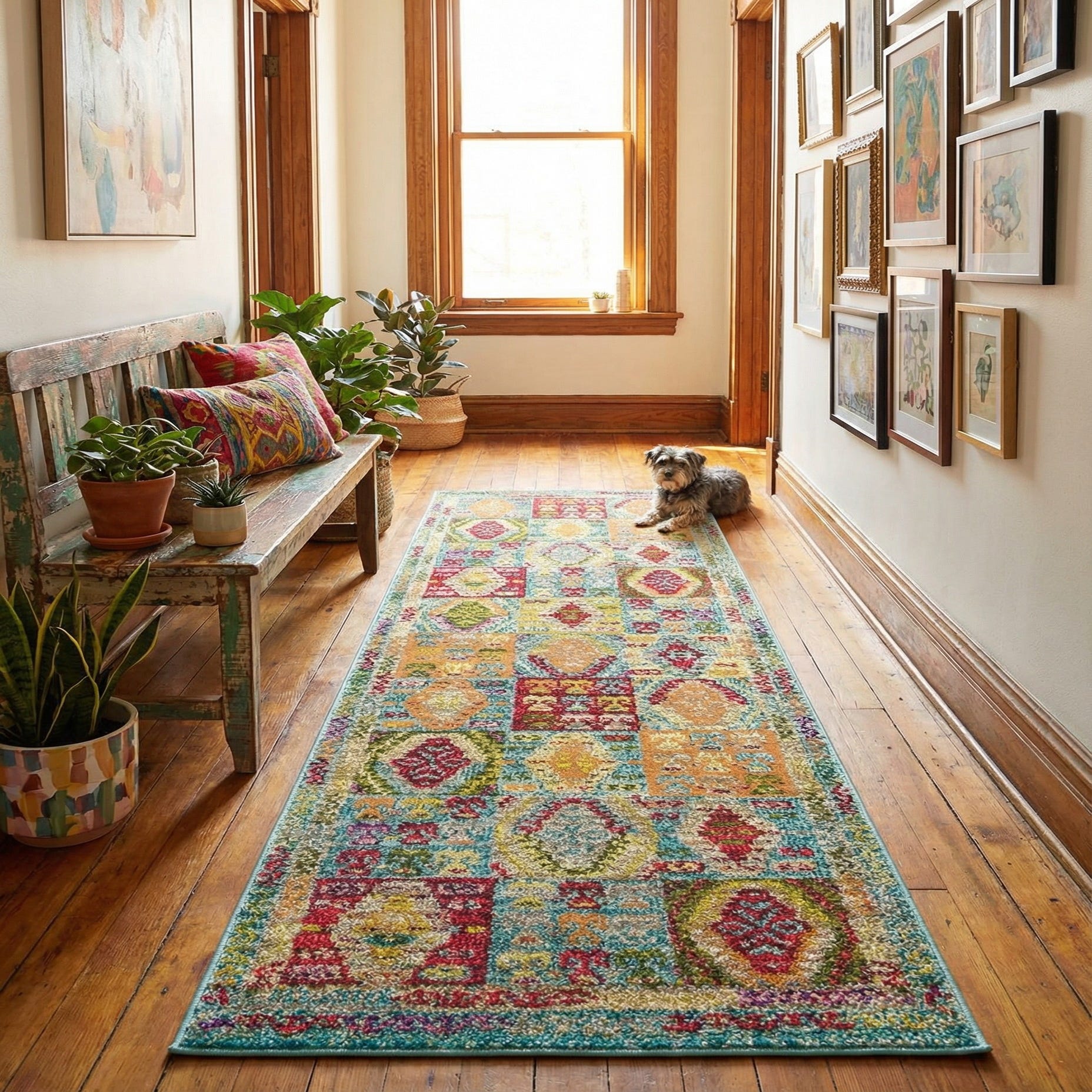 Place this runner in a hallway, kitchen galley, or at the foot of a bed to introduce color and pattern where traffic is frequent. It pairs well with warm wood tones and neutral upholstery for a balanced contrast, or with eclectic, bohemian décor to echo the rug’s spirited palette. The light blue ground also complements coastal and modern farmhouse schemes when you want a fresh, colorful accent.