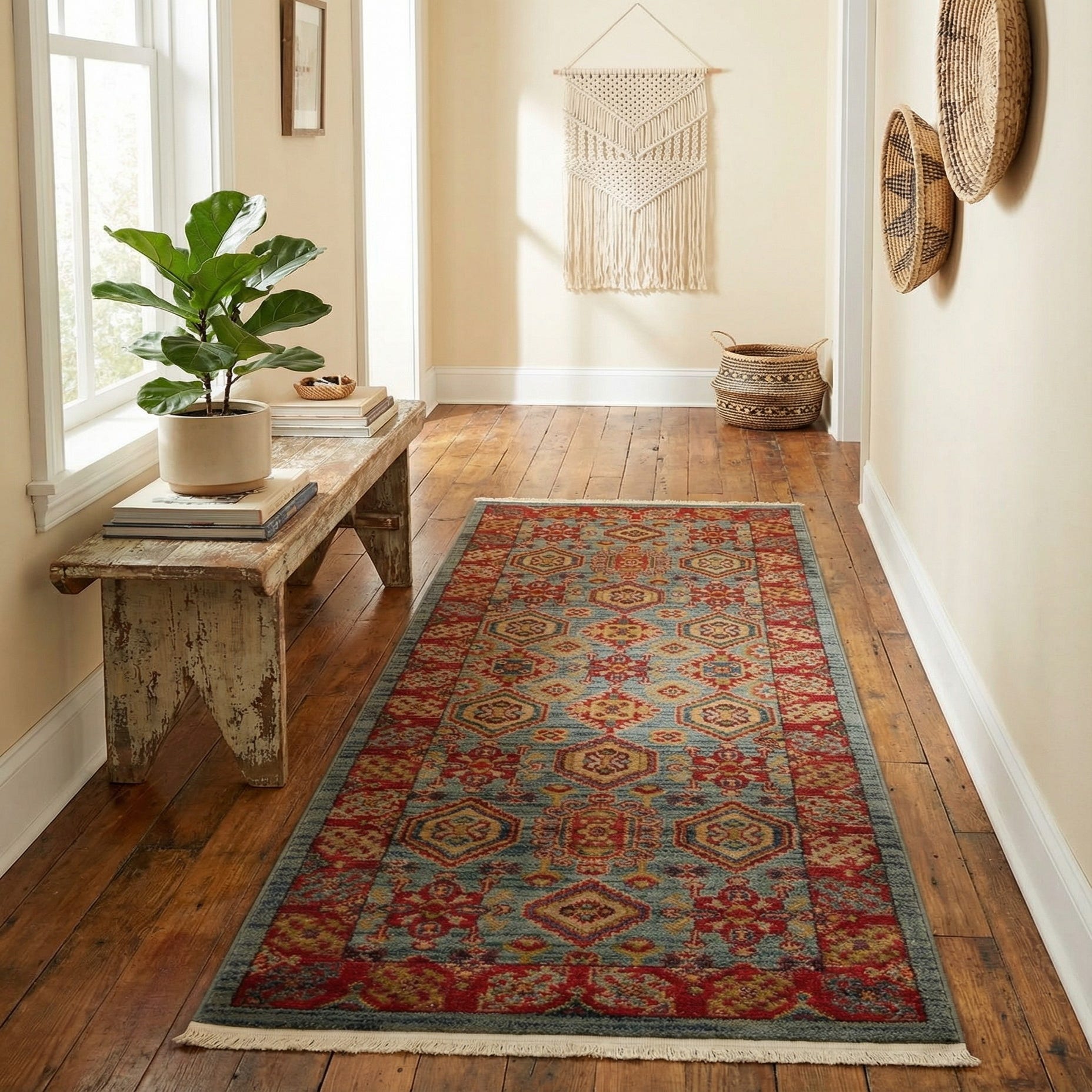 Machine-made from 100% polypropylene, the rug has a low-to-medium pile that feels slightly cushioned underfoot and shows the pattern with clear definition. The surface has a subtle texture that highlights the contrast between the soft light-blue background and the bolder reds and tans. Use this runner to anchor a narrow foyer or corridor, add color to a kitchen galley, or layer in front of a sofa in a transitional living room. It pairs well with warm wood floors, white trim and linen upholstery, and complements both traditional and casual coastal or farmhouse schemes.