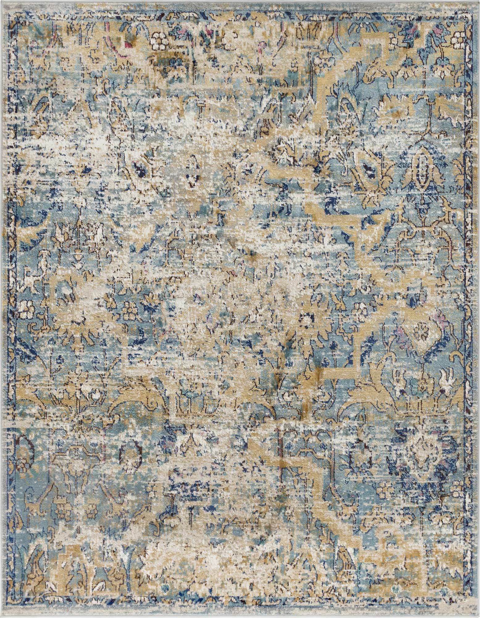 Primary color is Light Blue. Colors in this rug include: Light Blue, Tan, Ivory, Navy Blue, Brown, Green.